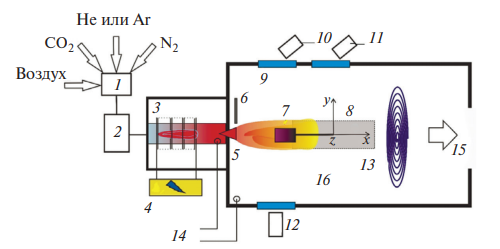 Рис. 2. Схема аэродинамической трубы ВАТ-104: 1 – измеритель расхода рабочего газа, 2 – система регуляторов расхода рабочего газа, 3 – высокочастотный индукционный подогреватель газа, 4 – высокочастотный генератор, 5 – сопло АДТ, 6 – зеркало для измерения распределения температуры передней поверхности исследуемого образца, 7, 8 – координатные механизмы, 9 – оптические окна, 10 – пирометр, 11 – видеокамера для регистрации режима обтекания модели, 12 – тепловизор, 13 – теплообменник, 14 – места подключения датчиков давления, 15 – система вакуумирования, 16 ‒ рабочая камера.