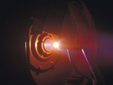 При температурах поверхности до 3000 К испытаны 20 образцов супервысокотемпературных керамик на базе диборида гафния (циркония) в виде дисков диаметром 20 мм и толщиной 4–6 мм. На рис. 5 представлена фотография типичного испытания образца керамики. На фото малозаметна разреженная плазменная струя из-за свечения образца, нагретого до ≈3000 К.