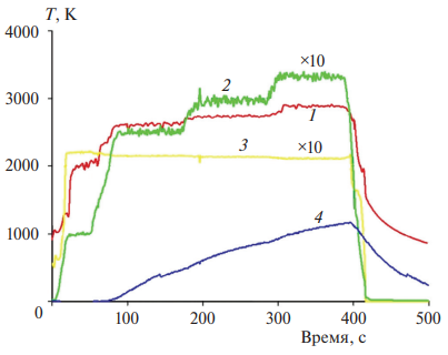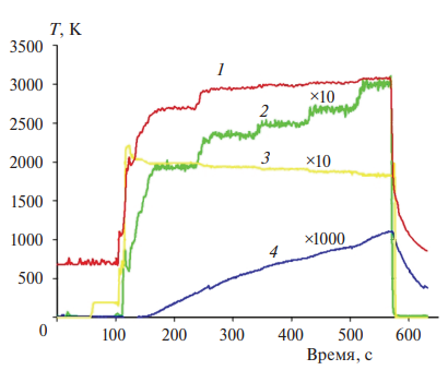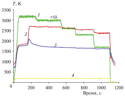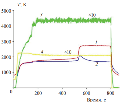 На рис. 6 представлен типичный режим испытания образца керамики на базе диборида гафния в высокоскоростном потоке воздушной плазмы. Здесь кривая 1 – яркостная температура передней поверхности образца, кривая 2 – яркостная температура задней поверхности образца, кривая 3 – давление в подогревателе: 435 гПа, кривая 4 – анодная мощность высокочастотного генератора, 225-210 кВт. Для удобства значения давления и анодной мощности подогнаны под шкалу температур с множителем 10.