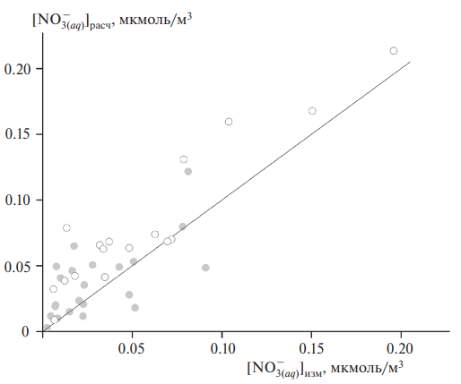 Рис. 2. Соответствие рассчитанных ([NO-3(аэр)]расч) и измеренных ([NO-3(аэр)]изм) концентраций нитратов серые точки в частицах аэрозоля над Антверпеном (19–21.12.2003 г.) [21]. Светлые точки – расчеты [NO-3(аэр)]изм с использованием усредненной по всем эпизодам концентрации паров азотной кислоты. Сплошная линия – соответствие данных с коэффициентом корреляции, равным единице.