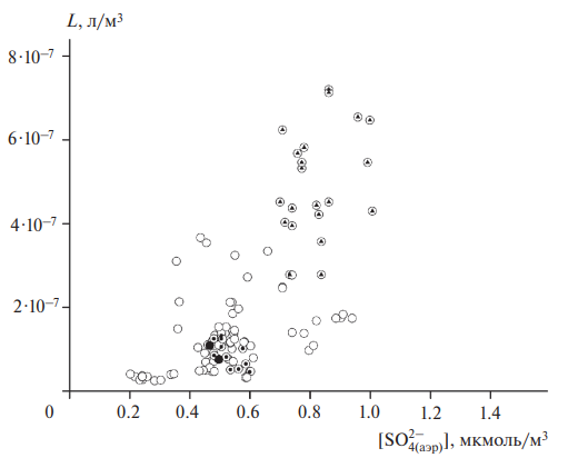 Рис. 4. Влияние содержания сульфатов на объемное содержание влаги в частицах дымки (Пекин, декабрь 2016 г.) – данные мониторинга и термодинамических расчетов [22]. Черные кружки в светлых кружках – выборка эпизодов с рН < 3.5, черные треугольники в светлых кружках – выборка с рН > 4.3 (см. текст).