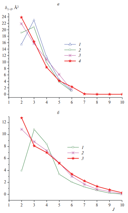 Из рис. 4а видно, что распределения времен жизни QC tQC очень чувствительны к виду ППЭ (ср. кривые 1, 2 и 3, 4) и слабо зависят от температуры (ср. кривые 1, 3 и 2, 4). Что касается распределения числа точек поворота N (рис. 4б), то влияние вида ППЭ практически отсутствует, однако более выражена зависимость от температуры (большее число N характерно для T = 100 K).