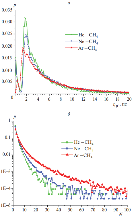 - Исследование статистических распределений характеристик QC имеют важное значение для анализа их разнообразных проявлений, в том числе газокинетических и спектроскопических. Метастабильные димеры, образующиеся в столкновениях CH4 c атомами He, Ne и Ar, могут быть как короткоживущими (tQC < τс), так и весьма долгоживущими по сравнению с средним временем столкновений τс и иметь разные размеры (~ 3–7 Å). Распределения прицельных параметров выявили предельные и наиболее благоприятные значения b для формирования QC. В рассмотренных случаях наиболее благоприятные значения соответствуют b ~ 6 Å. Сравнение распределений времен жизни QC со средним временем свободного пробега τ0 показало, что образование и распад QC в рассмотренных смесях метана можно рассматривать как бимолекулярный процесс лишь при давлениях менее ~ 3 атм.