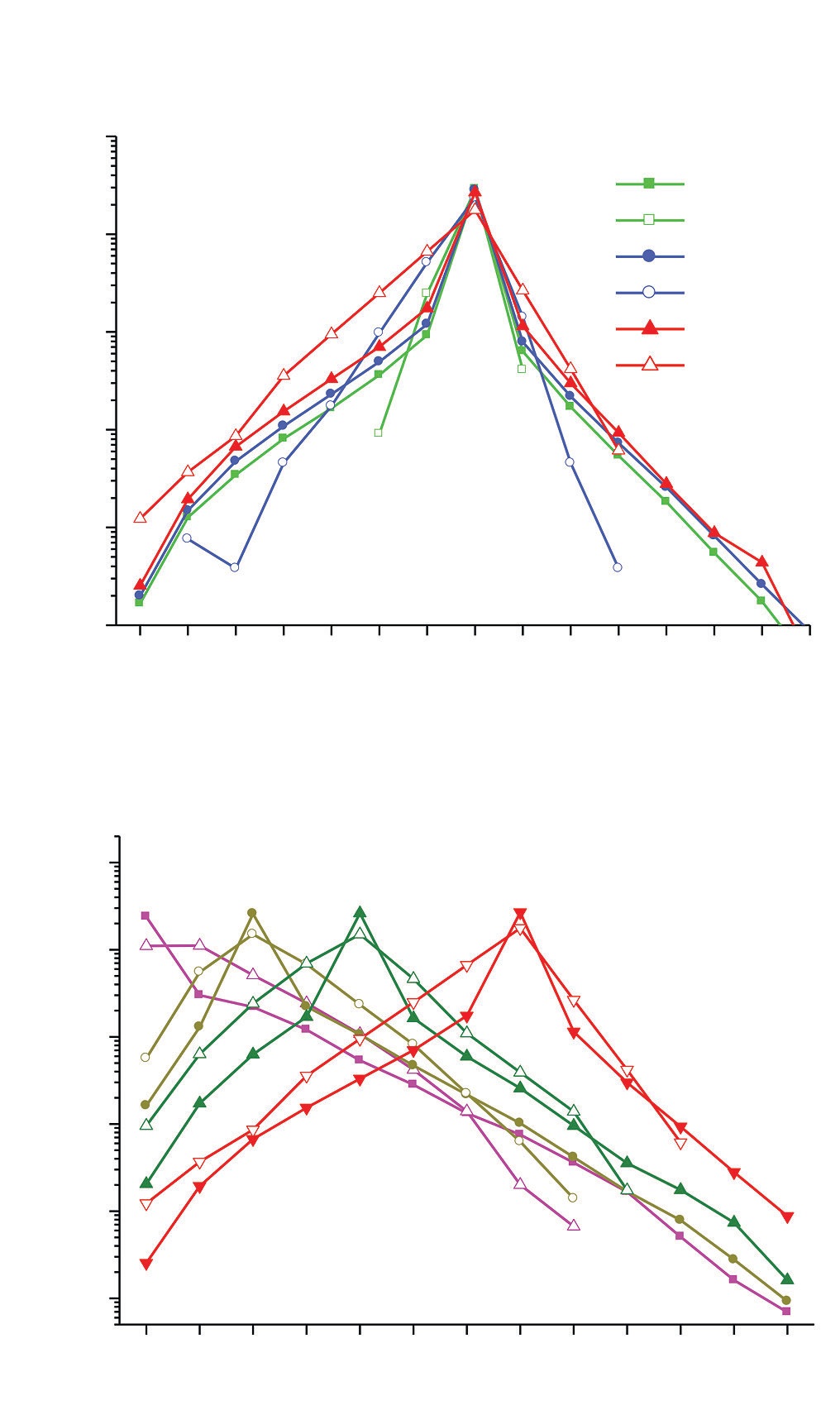 Рис. 9. а – сечения вращательных переходов J0 = 7 → J молекулы CH4 в столкновениях с He, Ne, Ar при T = 296 K; б – сечения вращательных переходов J0 → J молекулы CH4 в столкновениях с Ar для разных J0. Т = 296 К. Сплошные символы – все столкновения, светлые символы – только QC. Переходы J0 → J = J0 соответствуют упругим столкновениям.