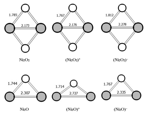 Рис. 1. Структуры электронейтральных, а также положительно и отрицательно заряженных окиси никеля Ni2O2 и закиси никеля Ni2O: серые кружки – Ni, белые – O. Числа – расстояния в ангстремах.