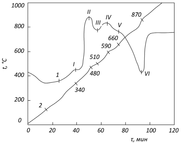 Рис. 3. График изменения температуры образца (2) и показаний дифференциальной термопары (1) во времени при нагревании в потоке воздуха.