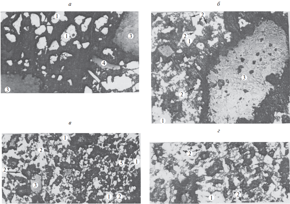 Рис. 4. Микроструктура исходного (а) и обожженных офлюсованных образцов, нагретых в потоке воздуха до 510 (б), 580 (в) и 660 °С (г): 1 – магнетит; 2 – гематит; 3 – кальцит; 4 – нерудные минералы; 5 – пирит Съемка в отраженном свете с увеличением микроскопа 150х.