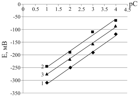 При изучении взаимодействия золя AgI с полисахаридами брали 7 мл раствора нитрата серебра и 10 мл раствора йодида калия одинаковой нормальности, помещали в колбу на 50 мл, добавляли навеску АХТЗ или СХТЗ в количестве, необходимом для получения массовой доли полимера в 0.01, 0.1, 0.5, 1.0% и оставляли полученную смесь на 3 сут для набухания. Далее раствор доводили до 50 мл фоновым электролитом. Перед началом работы индикаторный электрод активировали путем повторяемых несколько раз измерений в стандартных растворах с различной концентрацией йодид-ионов. Такие измерения проводили до тех пор, пока отклик не стал быстрым и воспроизводимым. Равновесие устанавливалось в течение одной минуты. Градуировку электрода проводили по четырем растворам KI, полученным последовательным разбавлением 0.1 М раствора KI раствором KNO3. В диапазоне концентраций KI от 0.00002 до 0.02 моль/л наблюдается линейная зависимость потенциала индикаторного электрода (Е) от активности йодида калия (рС). Тангенс угла наклона прямой на графике в координатах E-рC несколько отличается от теоретической величины, составляющей 0.059 и равен 0.061, т.е. наблюдаемая зависимость является гипернернстовской. Так как значение нернстовского коэффициента отличается от теоретической величины только на 2 мВ, электрод можно считать обратимым к йодид-ионам [23].