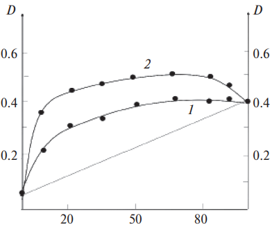 Рис. 4. Зависимость оптической плотности (D) водных дисперсий АХТЗ – золь AgI-1 (1) и СХТЗ – золь AgI-1 (2) от объемного соотношении исходных компонентов смеси. Концентрация полимера в растворе составляла 1%.