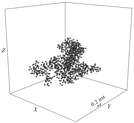 Тяжелые ионы Nd+ распределены по объему МД неравномерно (рис. 5). Эта неравномерность может быть обусловлена рядом факторов: формой используемых потенциалов взаимодействия, пренебрежением влияния поляризуемости на взаимодействие ионов, влиянием периодических граничных условий и др. Однако не исключено, что такая неоднородность будет встречаться и в реальных системах расплавленных солей в силу некоторых других причин, например недостаточно эффективного перемешивания. Трехвалентные ионы Nd3+ склонны удерживать возле себя ионы F -. В силу малой подвижности ионов Nd3+ картина их распределения по МД ячейке мало меняется с ростом температуры. В этом случае температурные изменения морфологии Nd–F-сети происходят в основном благодаря значительно более подвижным ионам F -. Сеть Nd–F, полученная при температуре 1020 K, выглядит как скопление неправильной формы (рис. 6). При всех рассмотренных температурах размер Nd–F-сетей уступает размеру Li–F-сетей. Однако их появление также должно оказывать влияние на значение коэффициента теплопроводности солевой смеси.