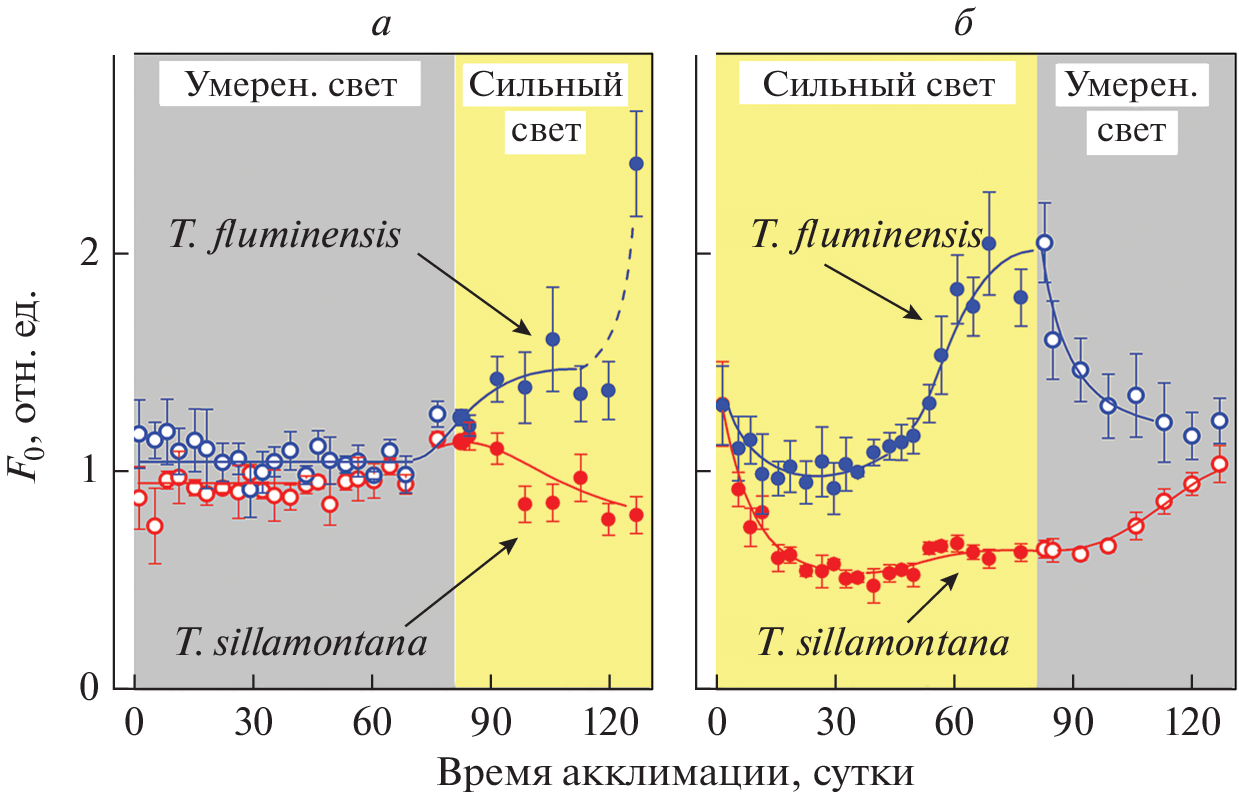 In this work we investigated the electron transport processes in chloroplasts of two contrasting species of Tradescantia, the shade-tolerant species T. fluminenesis and the light-loving species T. sillamontana, grown under moderate or strong light conditions. Plants were acclimated to a moderate or high intensity of photosynthetically active radiation. Photochemical activity of Photosystem 2 (PS2) was assayed by measuring chlorophyll a (Chl a) fluorescence, using the OJIP test, and by monitoring a slow induction of Chl a fluorescence (SIF) in Tradescantia leaves in vivo and in situ. The coefficient of non-photochemical quenching (NPQ) of Chl a fluorescence was determined from the SIF kinetics. Photochemical activity of photosystem 1 (PS1) was determined by electron paramagnetic resonance from the light-induced redox transients of P700, photoreaction center of PS1. Shade-tolerant (T. fluminenesis) and light-loving (T. sillamontana) species showed clear differences in their photosynthetic characteristics depending on long-term (up to 5 months) acclimatization to moderate (50–125 µmol photons m–2 s–1) or strong (850–1000 µmol photons m–2 s–1) irradiation with photosynthetically active white light. In the leaves of light-loving species T. sillamontana, the photosynthetic characteristics changed only slightly upon variations of light intensity. Leaves of the shade-tolerant species T. fluminenesis exhibited a pronounced sensitivity to changes in light intensity during acclimatization, showing a reversible increase in NPQ accompanied by an attenuation of PS2 photochemistry. After the reduction of light intensity, photochemical activity of PS2 recovered.
