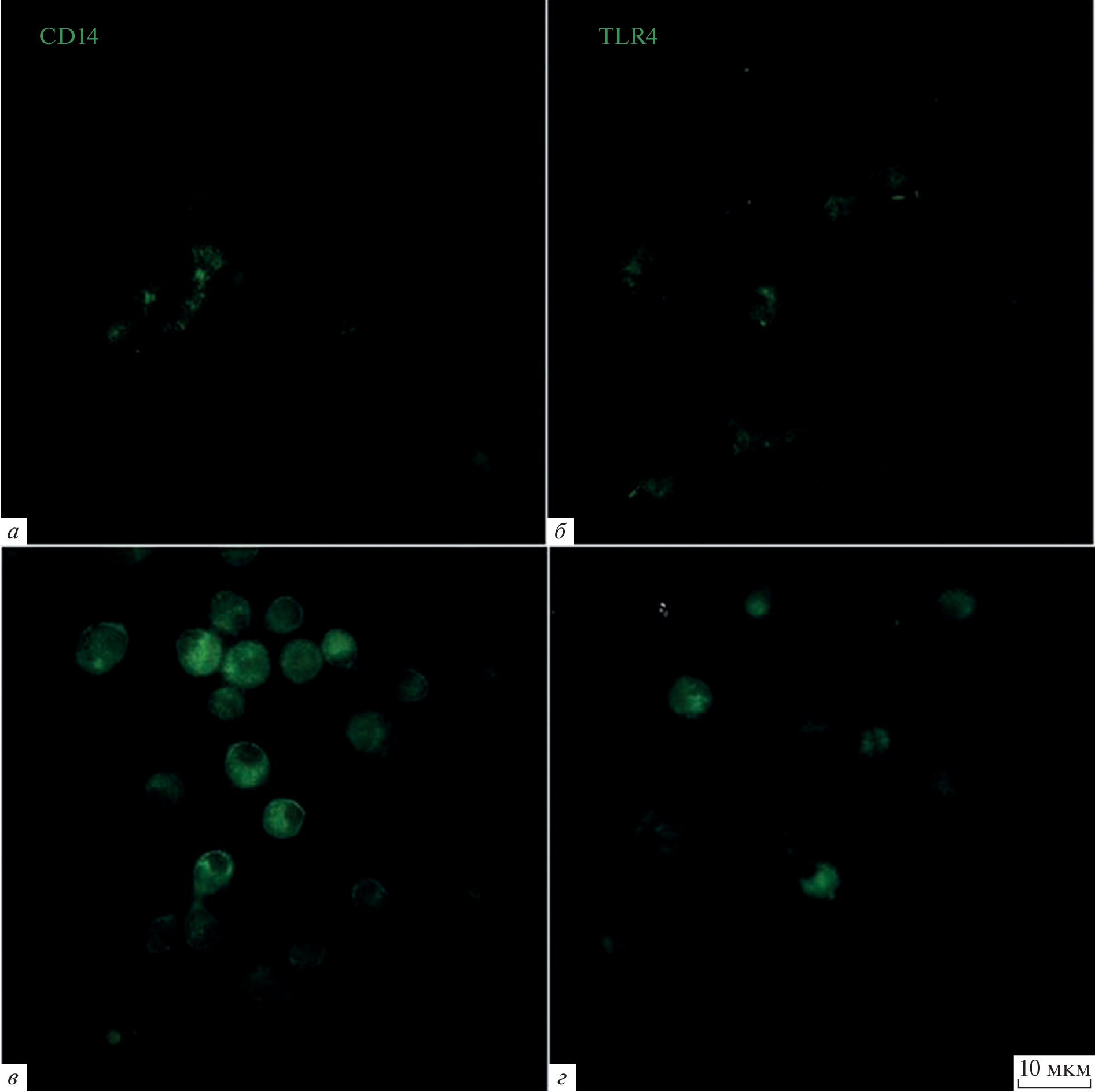 One of the main stages of infectious process, which mostly determines the course and outcome of the disease, is the initial contact of the pathogen with the host cells. The lipopolysaccharide as a component of the outer membrane is crucially involved in the interaction between Gram-negative bacteria and immunocompetent host cells. It triggers immune reactions by interaction with specific receptors, mainly CD14 and TLR4. The aim of this work was to quantify the force characteristics of the interaction of Yersinia pestis EV lipopolysaccharide with CD14 and TLR4 receptors on the surface of mouse macrophages J774 by atomic force microscopy. Lipopolysaccharide was extracted from Y. pestis cells (vaccine strain EV) grown at 27°С. The expression of receptors on the cell surface was evaluated by fluorescent and confocal microscopy. Using monoclonal antibodies against CD14 and TLR4 receptors, force spectroscopy was used to estimate the force characteristics of the interaction between lipopolysaccharide on the cantilever surface and J774 macrophages immobilized on a glass substrate. The conditions for immobilization of J774 macrophages on glass were developed that allowed scanning the cell surface and estimating the adhesion force of target antigens to the cells. Incubation of macrophages in solutions with monoclonal antibodies against CD14 and TLR4 receptors caused a decrease in the major force characteristics of the interaction in the J774 macrophage – Y. pestis lipopolysaccharide system compared to the system containing untreated macrophages. A similar effect was observed after pretreatment of the cells with a solution containing the same lipopolysaccharide without monoclonal antibodies. The results show the ability of the Y. pestis lipopolysaccharide chemically bound to the cantilever to interact with CD14 and TLR4 receptors on the macrophage surface.