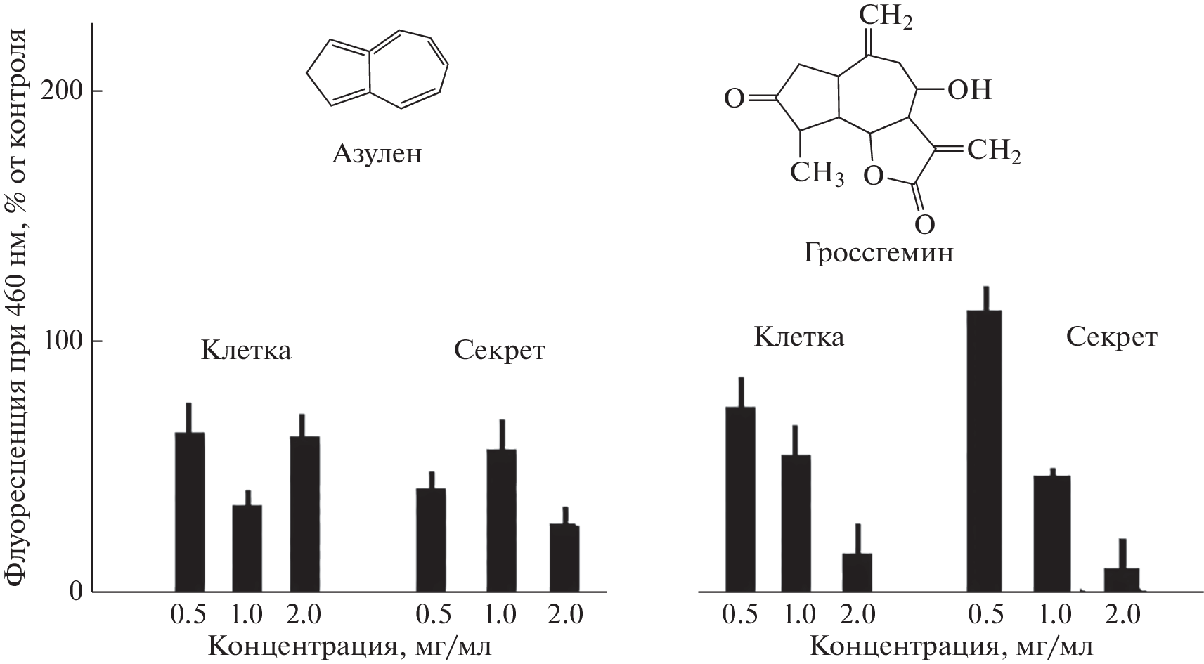 Исследованы спектральные свойства поверхности растительных клеток различного эволюционного уровня от одноклеточных (диатомовых водорослей, спор хвоща и папоротника) до многоклеточных (древесных и травянистых видов) организмов. Показано, что поверхностные слои кутикулы и клеточной стенки ряда анализированных растений включали антиоксиданты – синие пигменты азулены. С помощью гистохимических методов обнаружено, что здесь также могут присутствовать нейротрансмиттерные соединения (биогенные амины), выделяемые в виде экскретов всей поверхностью или из специализированных секреторных структур листьев. В условиях высокой концентрации соли наблюдается выделение слизи, содержащей дофамин и гистамин, что блокируется добавлением экзогенного азулена и проазулена гроссгемина. Предполагается, что азулен поверхности защищает ее от образующихся активных форм кислорода и токсичных в высоких концентрациях биогенных аминов.