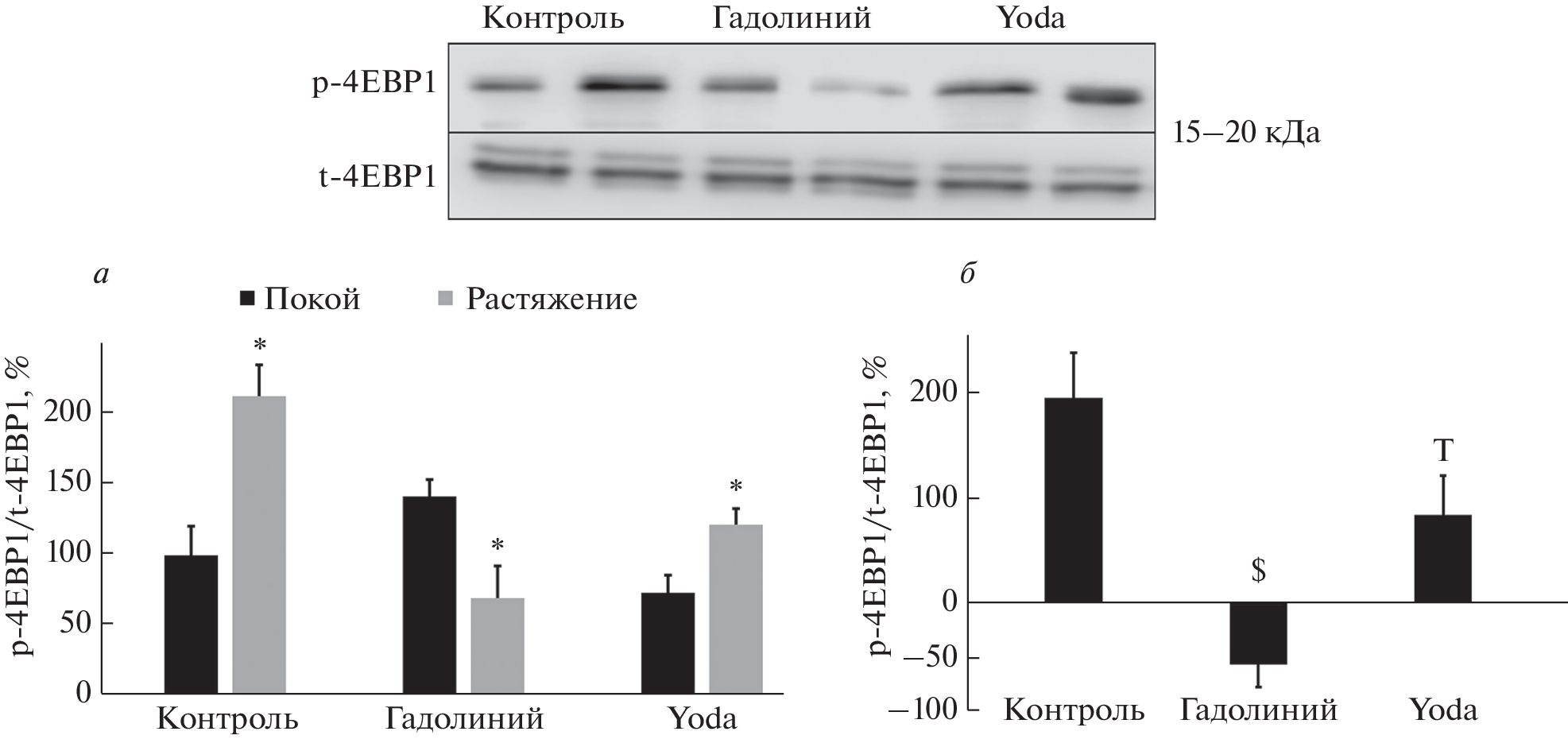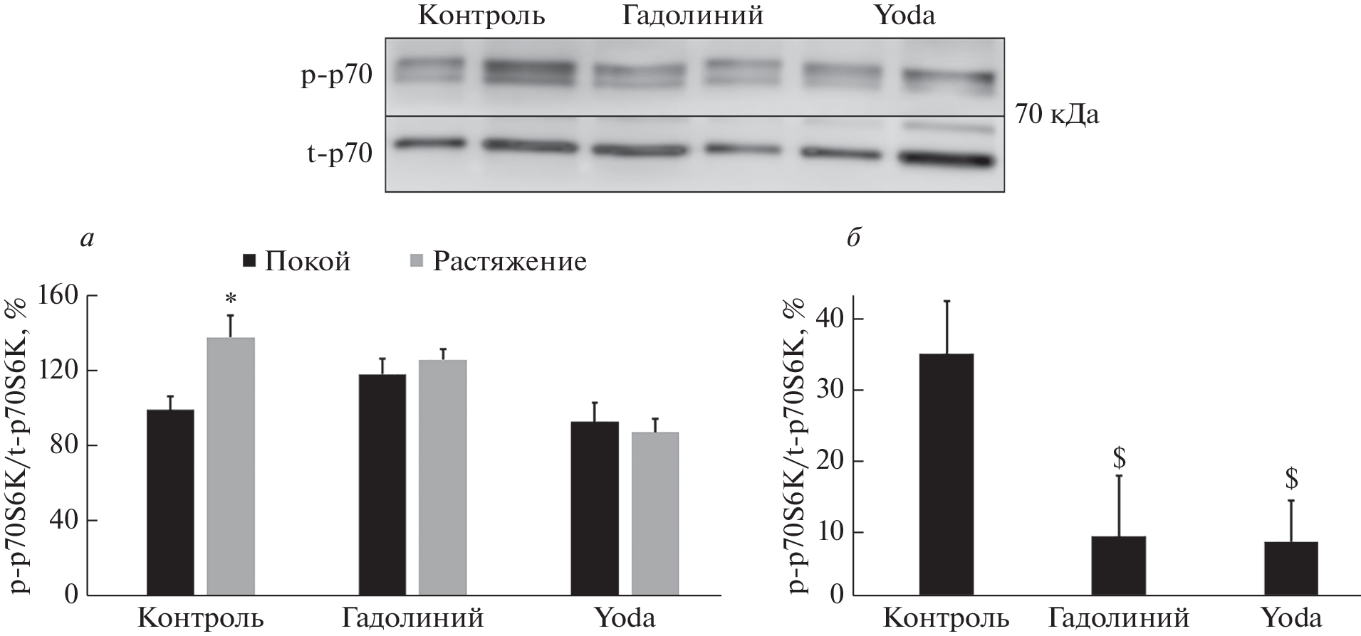 It is known that mTORC1-dependent pathway is involved in the activation of muscle protein synthesis and hypertrophy in response to mechanical stress. However, mechanosensors that mediate sensing and transmission of mechanical signals to the mTORC1 signaling pathway (mechanotransduction) are not yet identified. Mechanically activated (MA) ion channels are viewed as potential candidates for the role of such sarcolemmal mechanosensors. The aim of our work was to investigate the potential role of MA channels (Piezo1) in the activation of the mTORC1 pathway in the isolated rat soleus muscle in response to mechanical stress. Wistar rats were divided into 3 groups: 1) “Control” (isolated muscles were not exposed to MA channel inhibitor or Piezo1 channel activator); 2) “Gadolinium” (muscles were incubated with MA channel inhibitor, gadolinium chloride); 3) “Yoda” (muscles were incubated with Yoda1, Piezo1 activator). In rats from each group, the soleus from the left limb was incubated in the appropriate solution without mechanical stress in the form of a passive stretching, and the soleus from the right limb was subjected to passive stretching and then incubated in the appropriate solution. Phosphorylation of mTORC1 targets (p70S6K, rpS6, 4E-BP1) in rat soleus was determined by PAGE and immunoblotting. After passive stretching of the isolated soleus muscle there was an increase in phosphorylation of p70S6K, its substrate, rpS6, as well as 4E-BP1, by 38.5%, 168%, and 112%, respectively, compared to the soleus muscle that was not subjected to stretching. Incubation of the muscles with gadolinium completely prevented the activation of mTORC1 markers caused by stretching. Incubation of the soleus muscle in the solution with Yoda1 resulted in a decrease in the mechano-dependent phosphorylation of p70S6K, rpS6, and 4E-BP1 compared to a muscle that was not exposed to Yoda1. Thus, Piezo1 channels do not appear to play a role in the activation of mTORC1 signaling in rat soleus muscle in response to passive stretching.
