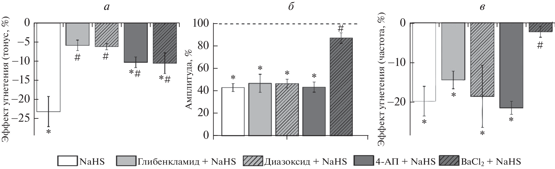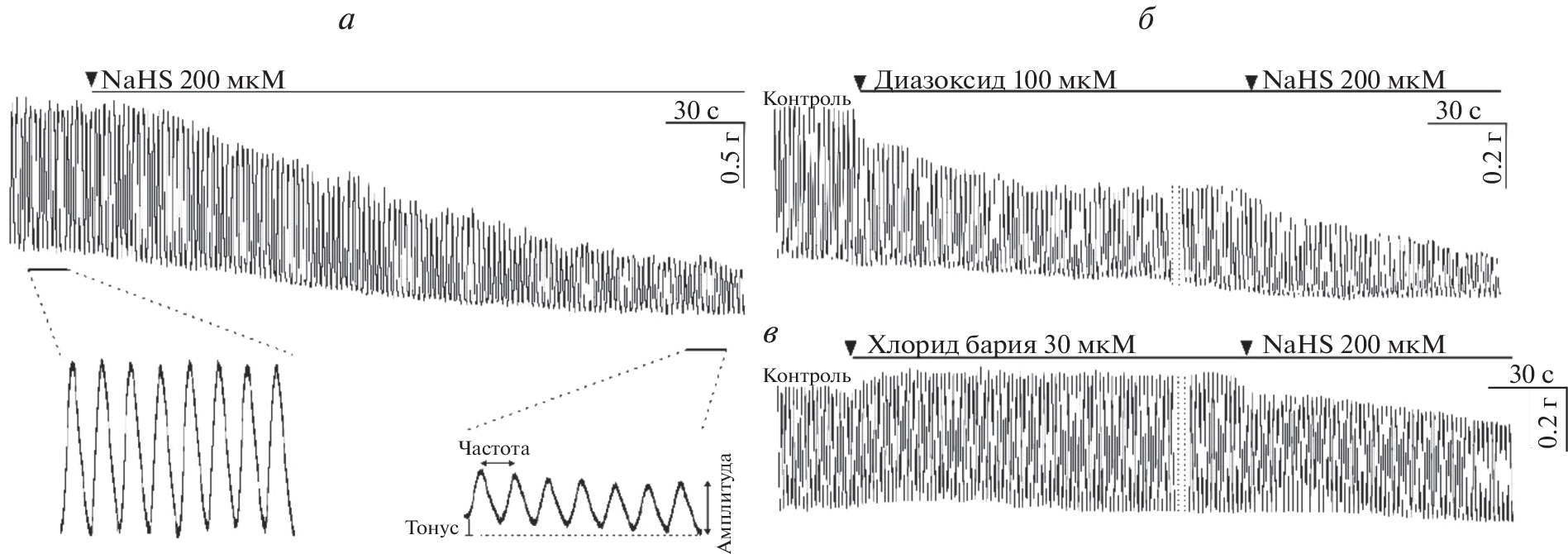 In this work, we analyzed the role of voltage-gated (KV), calcium-activated (KCa), and inward-rectifier potassium channels (Kir) in the effects of hydrogen sulphide (H2S) donor sodium hydrosulphide (NaHS) on the spontaneous contractile activity of the rat jejunum. Experiments were performed on jejunum segments under isometric contraction conditions. It was shown that NaHS reduced the basal tension of the segments, the amplitude, and the frequency of spontaneous contractions in a dose-dependent manner (10–500 μM); the half-effective concentration (EC50) of the inhibitory effect of NaHS on amplitude was 165 μM. The KV channel blocker 4-AP (200 µM) increased the amplitude of spontaneous contractions and subsequent application of NaHS (200 μM) suppressed the amplitude and frequency of spontaneous activity as well as in the control; the effect on tonic tension was less pronounced. TEA (3 mM), a non-specific blocker, and paxillin (1 µM), a specific blocker of large conductance KСа (ВK) channels, increased the amplitude of spontaneous contractions, while the inhibitory effect of NaHS was completely preserved. The selective blocker of small conductance KCa (SK) channels NS8593 (4 μM) did not affect the tension and the parameters of spontaneous contractions and did not prevent the effects of NaHS. Diazoxide (100 μM), the opener of КATP channels, caused a decrease in the basal tone, the amplitude and frequency of spontaneous contractions. Diazoxide and KATP channel blocker glibenclamide (50 μM) prevented the effects of NaHS on the basal tone. The Kir-channel blocker BaCl2 (30 µM) increased the amplitude of spontaneous contractions and eliminated the inhibitory effects of NaHS on the frequency and amplitude of spontaneous contractions, and the basal tension decrease was less pronounced compared to control. Thus, a decrease in the tonic tension of a rat jejunum preparation under the action of an H2S donor is associated with the activation of Kir, including КATP channels, while the effects of H2S on the amplitude and frequency of spontaneous contractions are mediated by an increase in Ba2+-sensitive conductance.