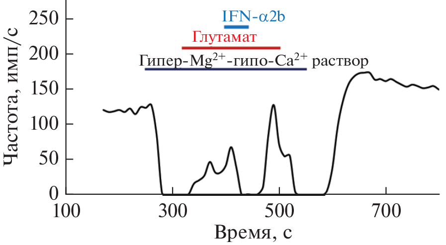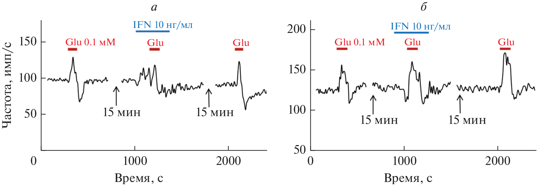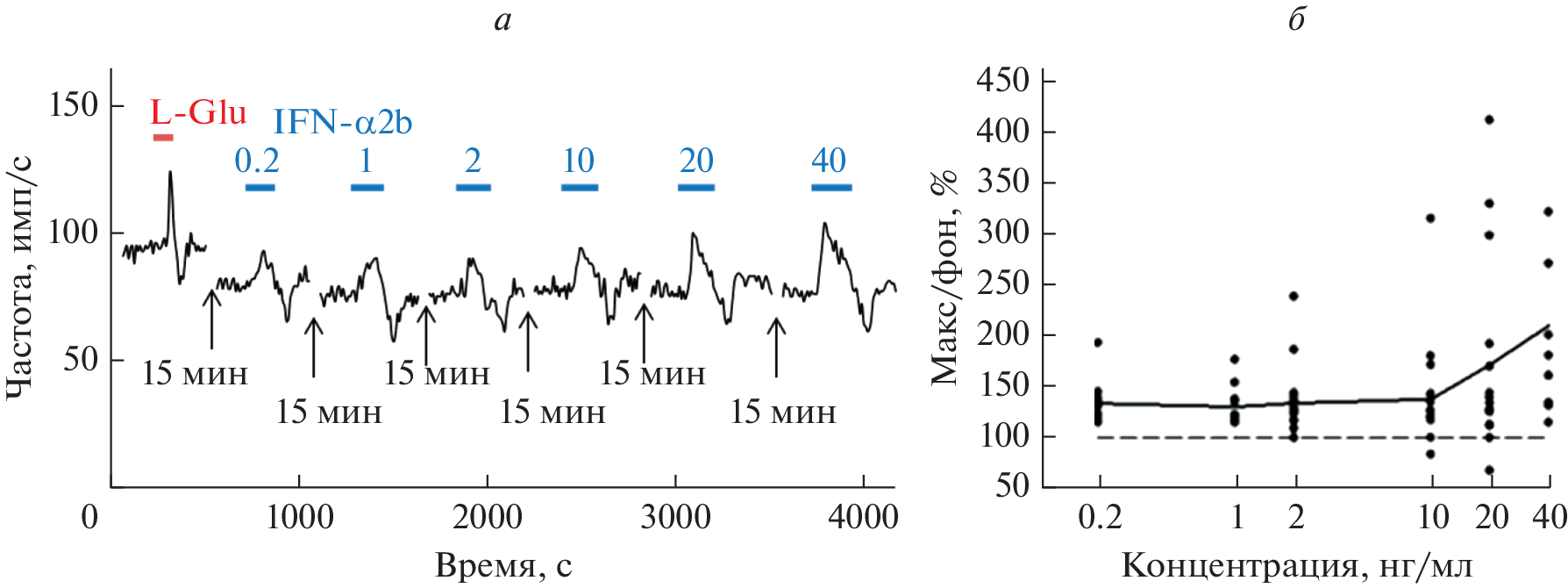 Известно, что молекулы, вовлеченные в формирование врожденного и адаптивного иммунного ответа, могут модулировать синаптическую активность центральной нервной системы. Интерфероны широко используются в лечении онкологических и вирусных заболеваний. Несмотря на то что интерфероны относят к ототоксическим веществам, механизм их воздействия на синаптическую активность внутреннего уха остается неизученным. Целью работы явилось изучение модулирующего влияния интерферона α2b (IFN-α2b) на функцию афферентного глутаматергического синапса в условиях аппликации препарата в синаптическую зону. Эксперименты были проведены на изолированном вестибулярном аппарате лягушки при помощи электрофизиологического метода. IFN-α2b (0.2–40 нг/мл) вызывал повышение фоновой импульсной активности афферентных волокон с последующим снижением частоты разрядов, как правило, в ответ на аппликацию высоких концентраций. IFN-α2b уменьшал ответ на аппликацию глутамата (L-Glu) и модулировал частоту активности афферентных волокон, восстановленную L-Glu на фоне блока выделения медиатора из волосковых клеток в гипер-Mg2+–гипо-Ca2+-растворе, что предполагает постсинаптическое влияние интерферона. Представленные данные свидетельствуют о нейромодулирующем действии IFN-α2b на синаптическую активность афферентного синапса вестибулярного аппарата.