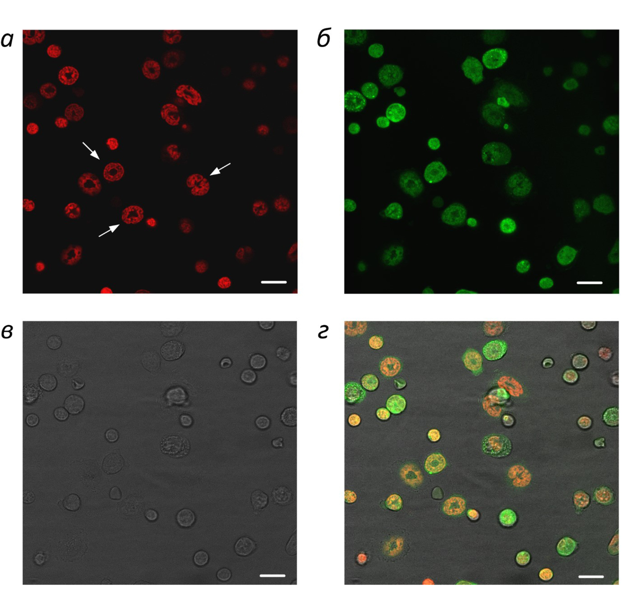 Рис. 3. Визуализация субъединицы α10 нАХР на КМ-гранулоцитах. Микрофотографии клеток после обработки первичным анти-α10 нАХР и вторичным AF488-анти-IgG антителами: а, б – флуоресцентные сигналы NucRed и AF488-α-CTX соответственно; в – изображение в видимом свете; г – наложение изображений. Примеры гранулоцитов показаны стрелками. Масштабная линейка: 10 мкм.