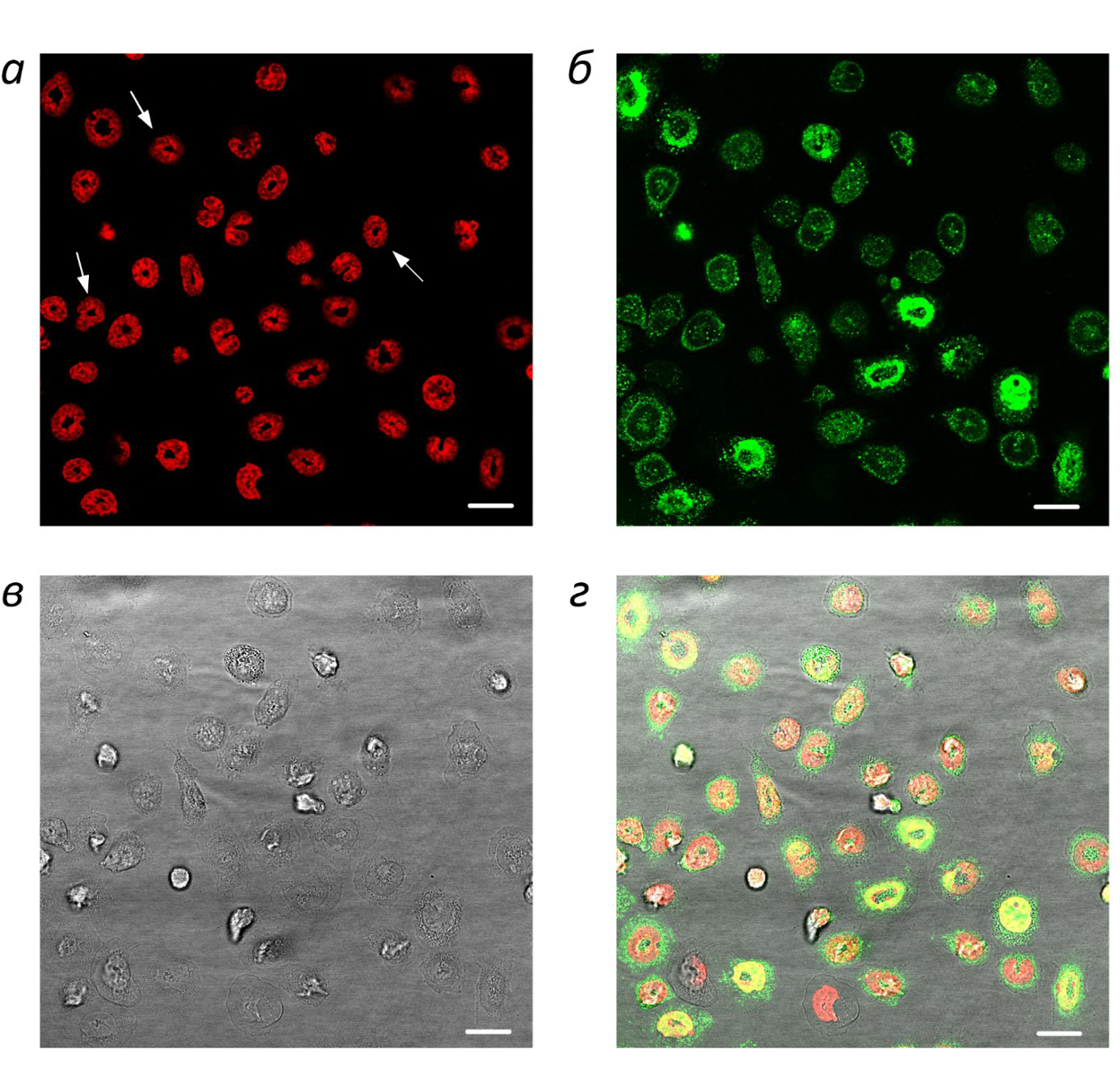 Рис. 2. Визуализация субъединицы α7 нАХР на КМ-гранулоцитах. Микрофотографии гранулоцитов костного мозга мыши: а, б – флуоресцентные сигналы NucRed и AF488-α-CTX соответственно; в – изображение в видимом свете; г – наложение изображений. Примеры гранулоцитов показаны стрелками. Масштабная линейка: 10 мкм.