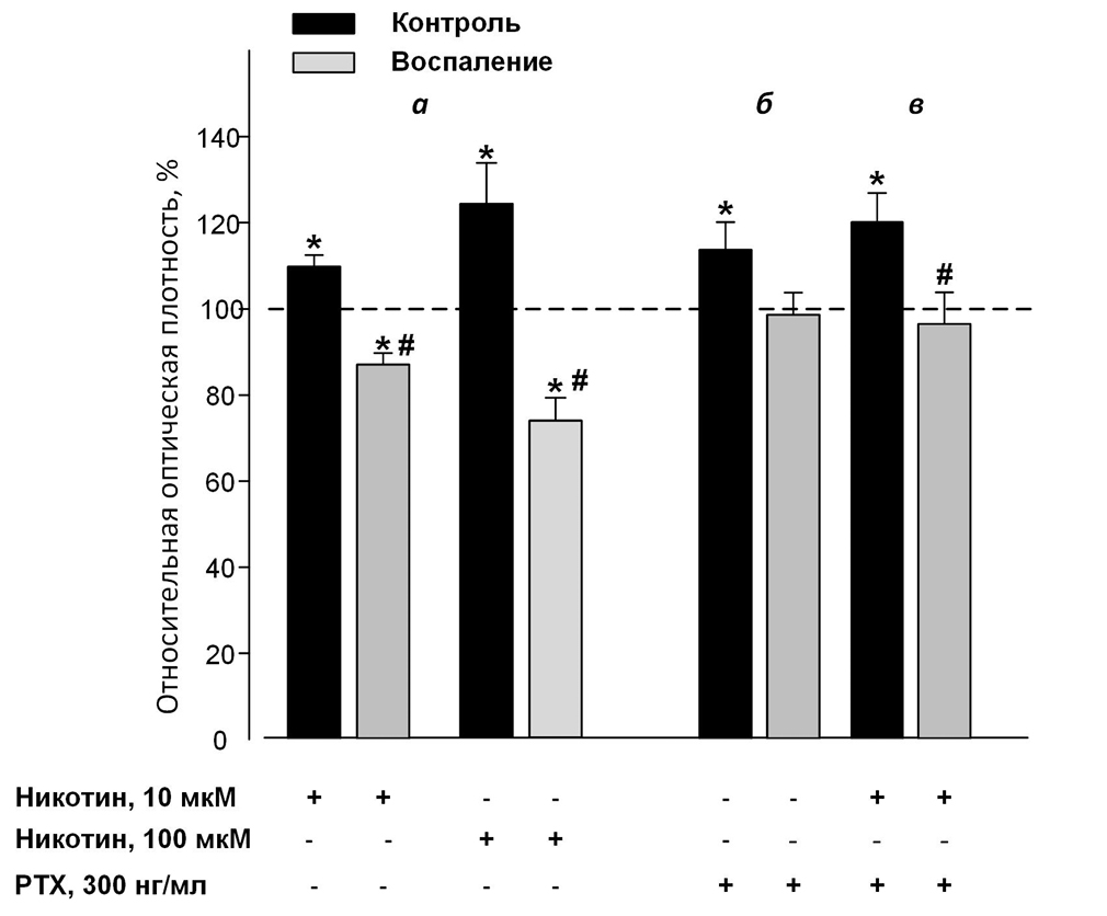 Селективный антагонист α7 нАХР α-СТХ (10 нМ) значительно усиливал адгезию нейтрофилов мышей обеих групп (рис. 1б, два столбца слева), что указывает на регуляторную роль α7 нАХР (с отрицательным знаком). Никотин, примененный совместно с α-СТХ, не влиял на адгезию в контрольной группе и существенно блокировал ее в группе животных с воспалением, так что величина их адгезии не отличалась от таковой у интактных клеток (рис. 1б, столбцы справа). Таким образом, в действии никотина на клетки животных с воспалением α7 нАХР обеспечивал положительную связь.
