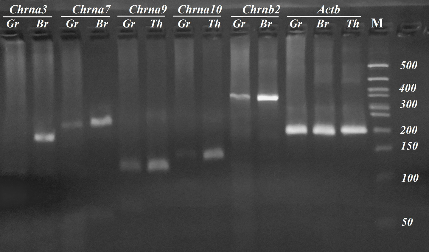Рис. 6. Пример результата электрофореза продуктов ПЦР в агарозном геле. Показаны синтезированные ампликоны субъединиц нАХР α3 (Chrna3), α7 (Chrna7), α9 (Chrna9), α10 (Chrn10), β2 (Chrnb2) и β-актина (Actb) в пробах гранулоцитов костного мозга мыши BALB/c (Gr), в образце из головного мозга мыши (Br) и образце из тимуса мыши (Th). Тимус и головной мозг мыши взяты в качестве положительного контроля. M – маркер длин ДНК (п. о.).
