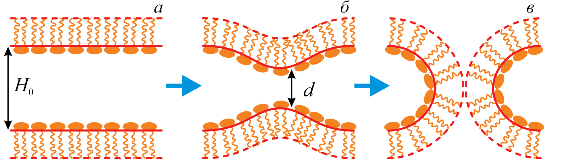 Рис. 1. Схематичное изображение процесса монослойного слияния. а – Начальное состояние: два плоских монослоя находятся на расстоянии H0 друг от друга. б – Образование локальных симметричных выпуклостей на расстоянии d. в – Образование монослойного сталка, т. е. плотного контакта мембран друг с другом.