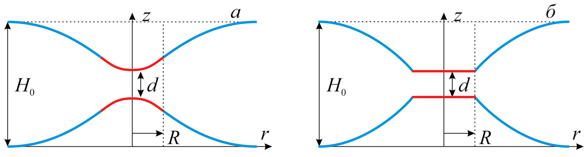 Рис. 2. Модели промежуточных стадий монослойного слияния. а – Локальные выпуклости радиуса R, находящиеся на расстоянии d друг от друга. б – Монослои с гидрофобными дефектами. Расстояние между мембранами при r → ∞ равно H0 и не меняется в процессе слияния.