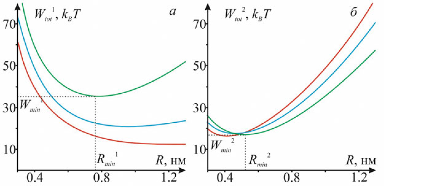 Алгоритм расчета. Описанные выше предположения позволяют найти энергетическую траекторию образования монослойного сталка в процессе слияния двух монослоев. Под энергетической траекторией понимается некоторая траектория вдоль энергетической гиперповерхности в координатах {R, d}, переводящая систему из начального состояния в состояние сталка. Мы фиксируем расстояние H0 между монослоями и рассматриваем зависимость энергии системы от наименьшего расстояния d между мембранами. В данном случае параметр d является координатой реакции. Монослой может находиться в двух состояниях – монослой с выпуклостью или монослой с гидрофобным дефектом. При каждом фиксированном значении расстояния d находим зависимость энергии Wtot1 выпуклостей от R. Эта энергия имеет минимум, соответствующий Rmin ~0.5–1 нм (см. рис. 3а). Минимальная энергия Wmin1 составляет несколько десятков kBT и быстро растет с уменьшением d. Мы находим минимальное значение энергии Wmin1 и соответствующее ему значение радиуса выпуклости Rmin1.