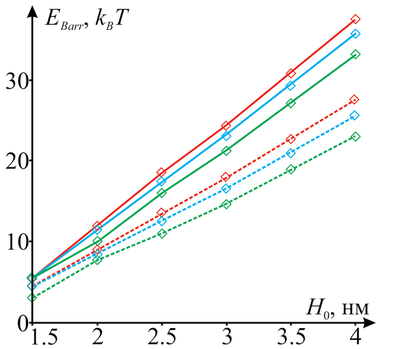 Рис. 5. Зависимость высоты барьера на образование монослойного сталка EBarr (kBT) от H0 для монослоев разного состава и при разном значении модуля Гауссовой кривизны KG. Красным показаны зависимости для монослоев из чистого DOPC, синим – для монослоев состава DOPC : DOPE = 3:1, зеленым – для монослоев состава DOPC : DOPE = 1:1. Сплошными линиями показаны зависимости для случая KG = –8 kBT, пунктирными линиями – для случая KG = –5 kBT. Значения упругих модулей и спонтанной кривизны для монослоев разного состава указаны в табл. 1.