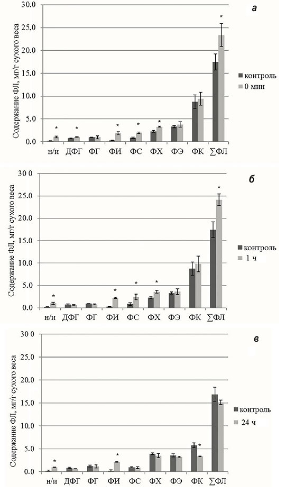 Рис. 1. Содержание фосфолипидов в тканях каллусов пшеницы (T. aestivum) сразу (а), через 1 (б) и 24 ч (в) после облучения НИЛИ He-Ne-лазера дозой 3.6 Дж/ см2. Приведены средние арифметические величины пяти биологических повторностей и их стандартные отклонения. Достоверность различий оценивали с помощью t-критерия (p < 0.05).
