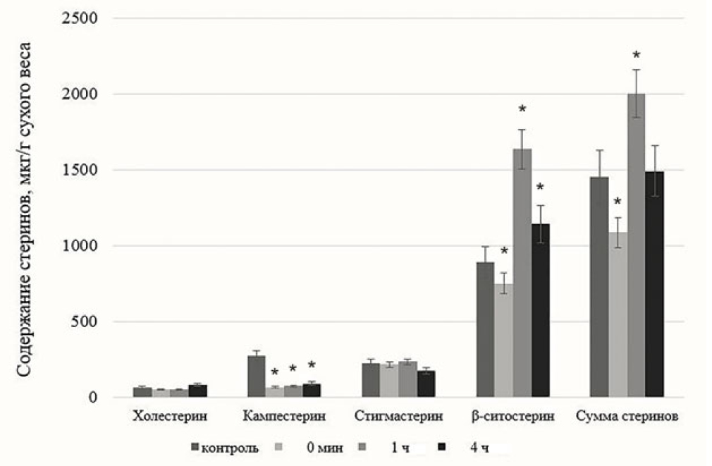 Данные, представленные на рис. 2, показывают, что основными стеринами в тканях каллусах пшеницы были (по порядку увеличения содержания в необлученных образцах) холестерин, стигмастерин, кампестерин и β-ситостерин.