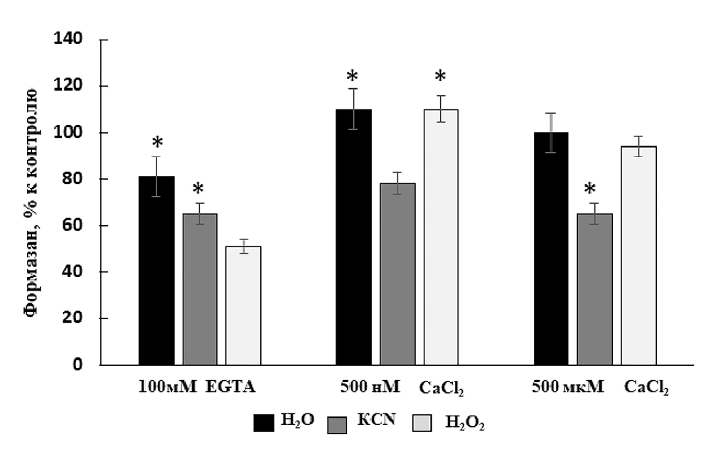 * В вариантах экспериментов “LaCl3”, “EGTA” полученные результаты сравнивали с контролем, которым служили проростки, инкубированные в воде (контроль, Н2О). Результаты ингибиторного анализа (с добавлением KCN, H2O2) сравнивали с аналогичными экспериментами (“LaCl3”, “EGTA”) без добавления ингибитора (контроль I).