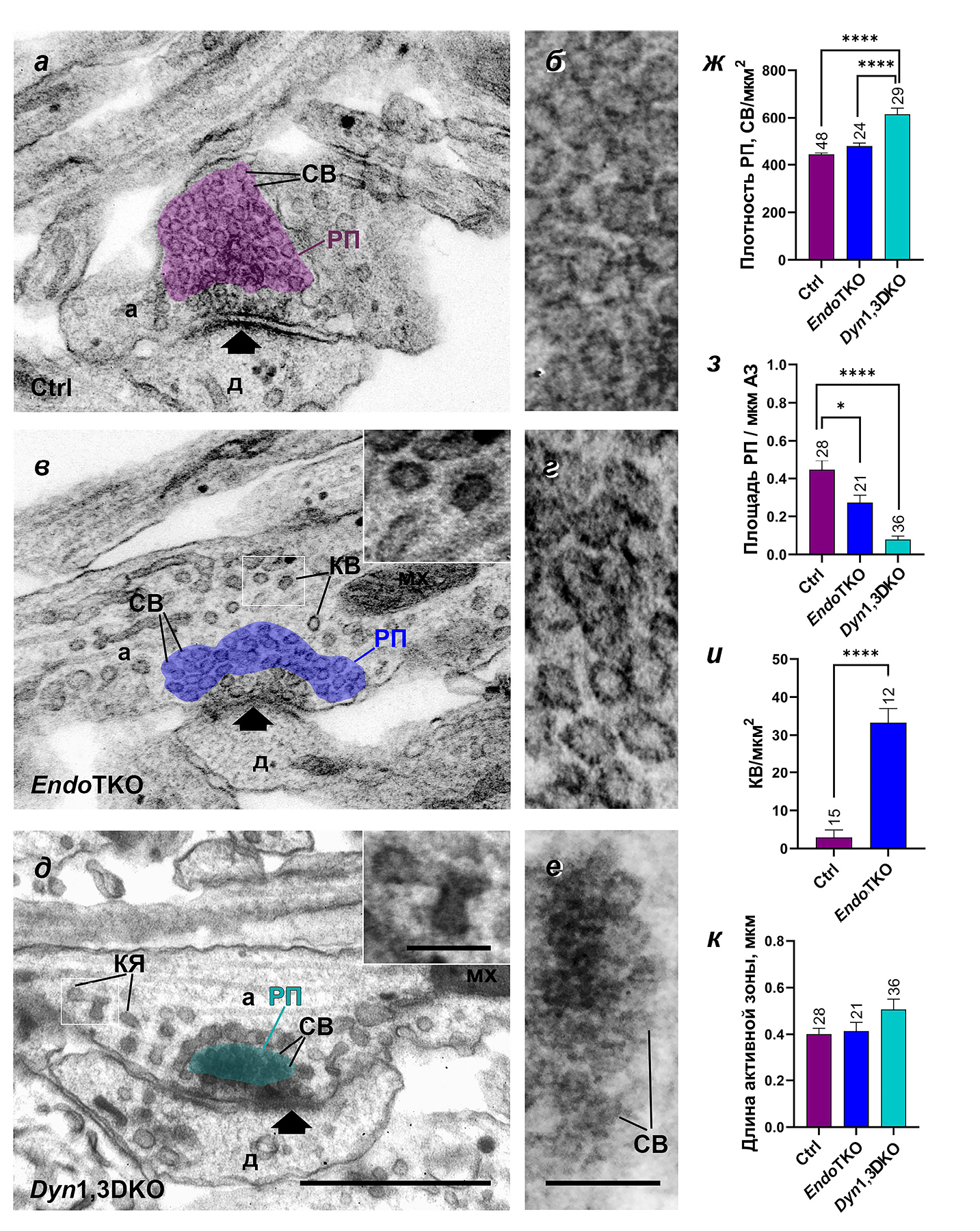 а, в, д – Электронные микрофотографии асимметричных синапсов в контрольной культуре нейронов (а), в культуре нейронов с тройным нокаутом по генам эндофилина (в) и с двойным нокаутом по генам динамина 1 и 3 (д) в покое. Зоны, содержащие клатриновые везикулы (в) и клатрин-окаймленные ямки (д), выделены белой рамкой и показаны на вставках при большем увеличении. На микрофотографиях б, г, е участки РП, изображенных на а, в, д, показаны при большем увеличении. Масштаб для а, в, д: 500 нм; для вставок на в, д: 100 нм; для б, г, е: 100 нм. Обозначения: а – аксон, д – дендрит, СВ – синаптические везикулы, РП – резервный пул СВ, мх – митохондрия, КВ – клатрин-окаймленные везикулы, КЯ – клатрин-окаймленные ямки, черная стрелка – активная зона. ж, з –Плотность (ж) и площадь (з) резервных пулов в контрольных, EndoTKO и Dyn1,3DKO синапсах; площадь РП нормализована к длине активной зоны. и – Плотность КВ в зоне 200 нм от границы РП в контрольных и EndoTKO синапсах. к – Средняя длина активных зон в исследованных группах. Данные представлены как среднее ± SEM. Цифры над столбцами указывают число исследованных синапсов.