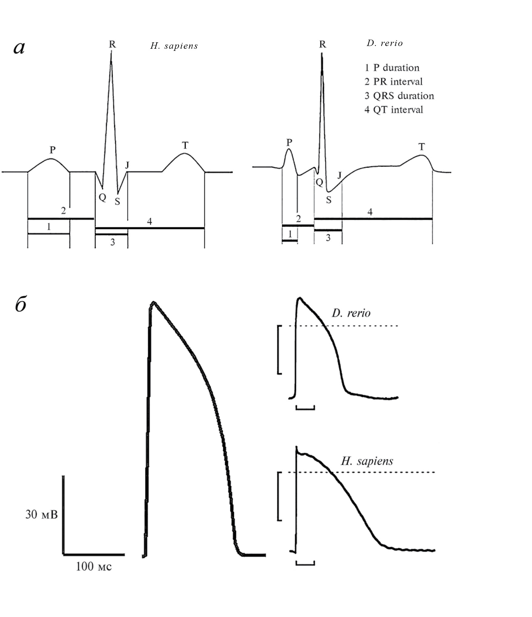 Nemtsas и соавторы [18] регистрировали ПД в предсердных и желудочковых миоцитах интактного изолированного сердца D. rerio. Анализ записей показал, что развитие деполяризации в клетках миокарда D. rerio происходит медленнее по сравнению с кардиомиоцитами млекопитающих. Авторы отмечают отсутствие начального спайка, характерного для ПД человека, наличие фазы плато и меньшую длительность ПД по сравнению с ПД кардиомиоцитов человека.