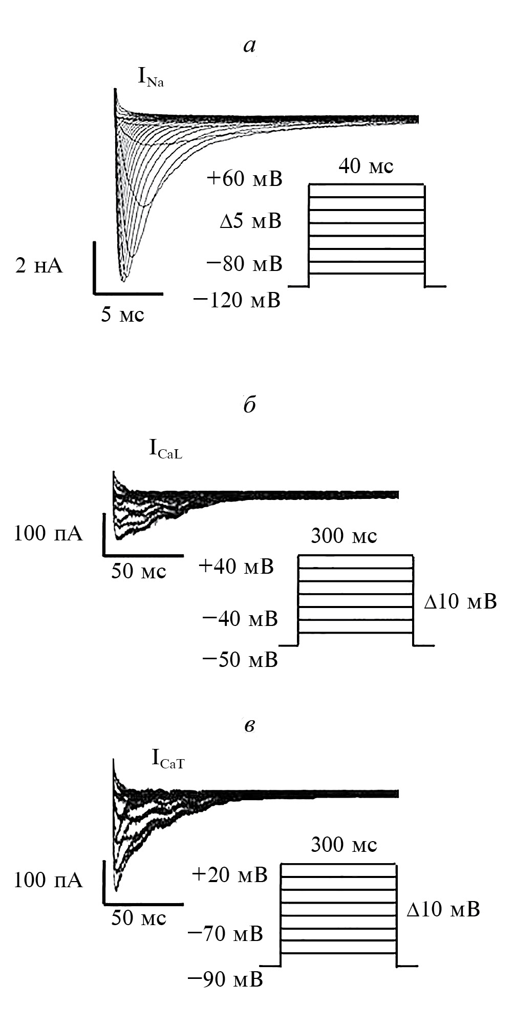 Рис. 3. Примеры записи потенциал-зависимых натриевого тока INa (а), кальциевых токов L-типа ICaL (б) и Т-типа ICaT (в) в изолированных желудочковых кардиомиоцитах D. rerio [19]. На врезках протоколы подачи тестирующих стимулов.