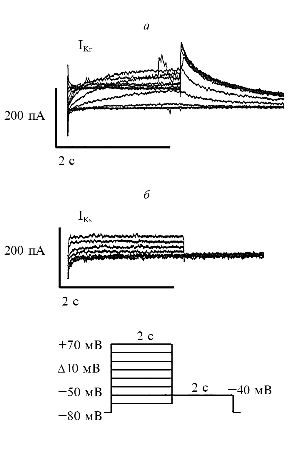 Рис. 4. Примеры записи калиевых токов задержанного выпрямления IKr (а) и IKs (б) в изолированных желудочковых кардиомиоцитах D. rerio [19]. На врезке протокол подачи тестирующих стимулов.