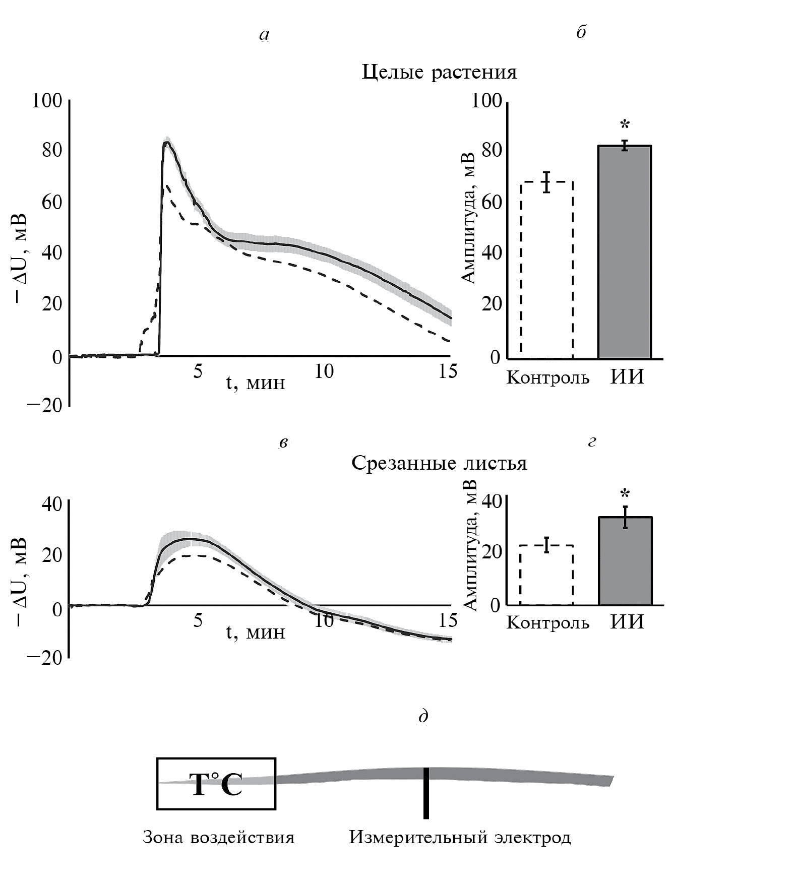 Рис. 1. Влияние ИИ на параметры ВП. а и в – Усредненные записи ВП у контрольных и облученных растений на целых растениях и отрезанных листьях соответственно; б и г – амплитуда ВП у контрольных и облученных растений на целых растениях и отрезанных листьях соответственно; д – схема эксперимента: расстояние между зоной воздействия и измерительным электродом 3 см; n = 8–16; *p <0.05.