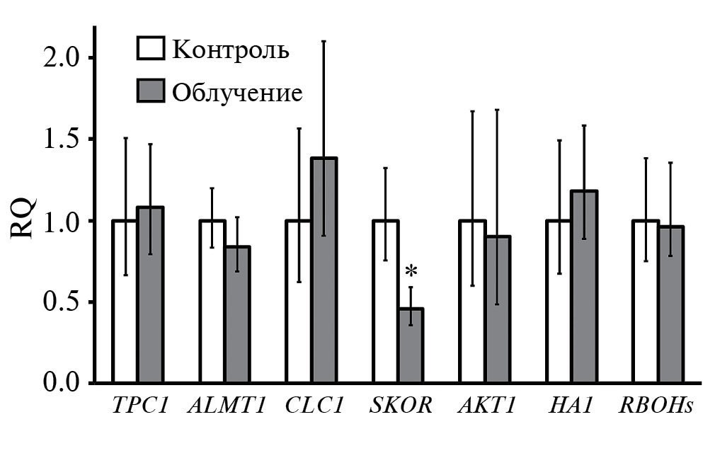 Влияние ИИ на экспрессию генов участников генерации и распространения ВП. По результатам ПЦР в реальном времени у облученных растений определили относительный уровень экспрессии генов белков, участвующих в генерации и распространении ВП (рис. 2). ИИ оказывает действие на экспрессию генов участников генерации ВП. Показано, что уровень экспрессии гена калиевого канала SKOR у облученных растений был статистически значимо ниже. На экспрессию гена двупорового кальциевого канала (TPC1), анионных каналов (ALMT1 и CLC1), калиевого канала входящего направления (АКТ1), H⁺-ATP-азы плазматической мембраны (HA1) и семейства NADPH-оксидаз ИИ не влияло.
