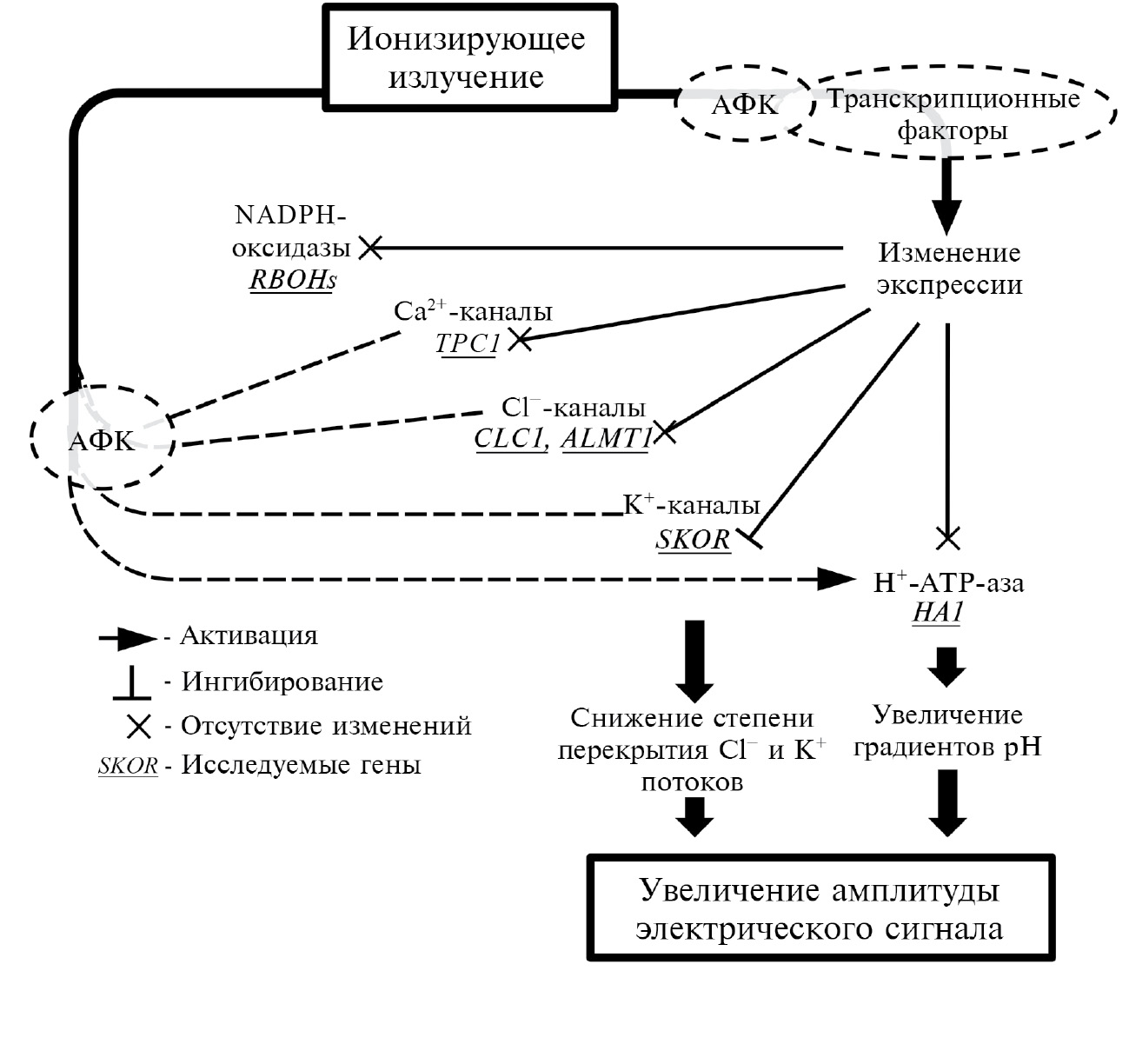 Наблюдаемое уменьшение экспрессии гена одного из основных функциональных участников электрогенеза – K⁺-канала – может объяснять увеличение амплитуды реакции (рис. 1) за счет снижения степени перекрытия анионного потока, отвечающего за развитие деполяризации, и калиевого потока, вовлеченного в развитие реполяризации. При модификации экспрессии большинства генов ключевыми участниками сигнального каскада, как правило, выступают транскрипционные факторы. При действии облучения в регуляции экспрессии генов ключевую роль играют транскрипционные факторы из семейств WRKY, MYB, HSF, ZAT [31, 37, 38], предположительно, за счет АФК, генерирующихся в ходе облучения [6]. Роль возможного претендента регуляции транскрипции K⁺-канала SKOR может выполнять транскрипционный фактор из семейства WRKY [39].