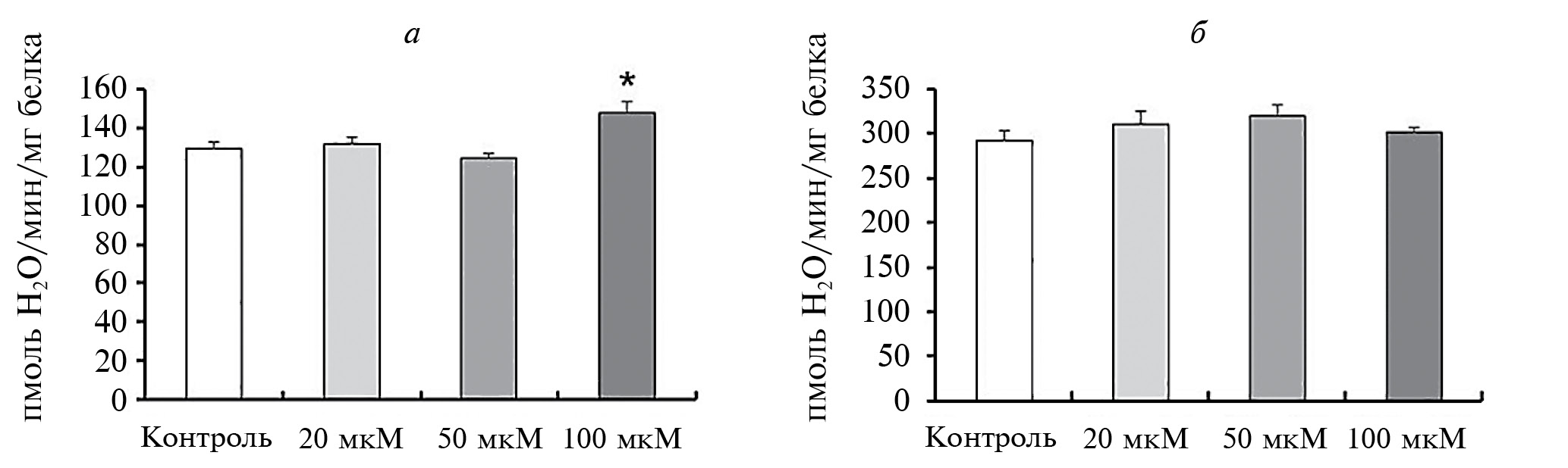 Рис. 4. Скорость образования H₂O₂ митохондриями скелетных мышц мышей, энергизованными глутаматом/малатом (а) или сукцинатом (б) в присутствии различных концентраций 20Е. Приведены средние значения ± ошибка среднего (n = 4). * p < 0.05 (по сравнению с контролем).