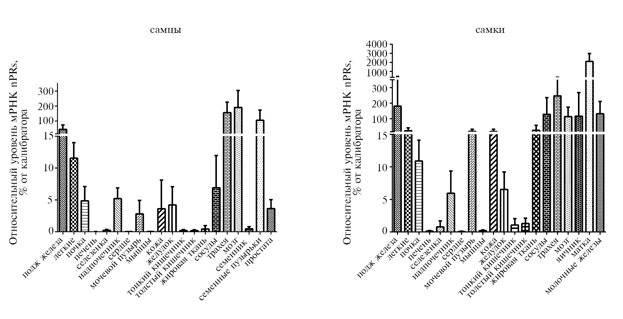 Рис. 1. Уровень экспрессии мРНК nPRs в органах самцов и самок крыс Wistar (нерепродуктивные ткани, n = 3, репродуктивные n = 5). Данные представлены в виде среднего ± стандартное отклонение.