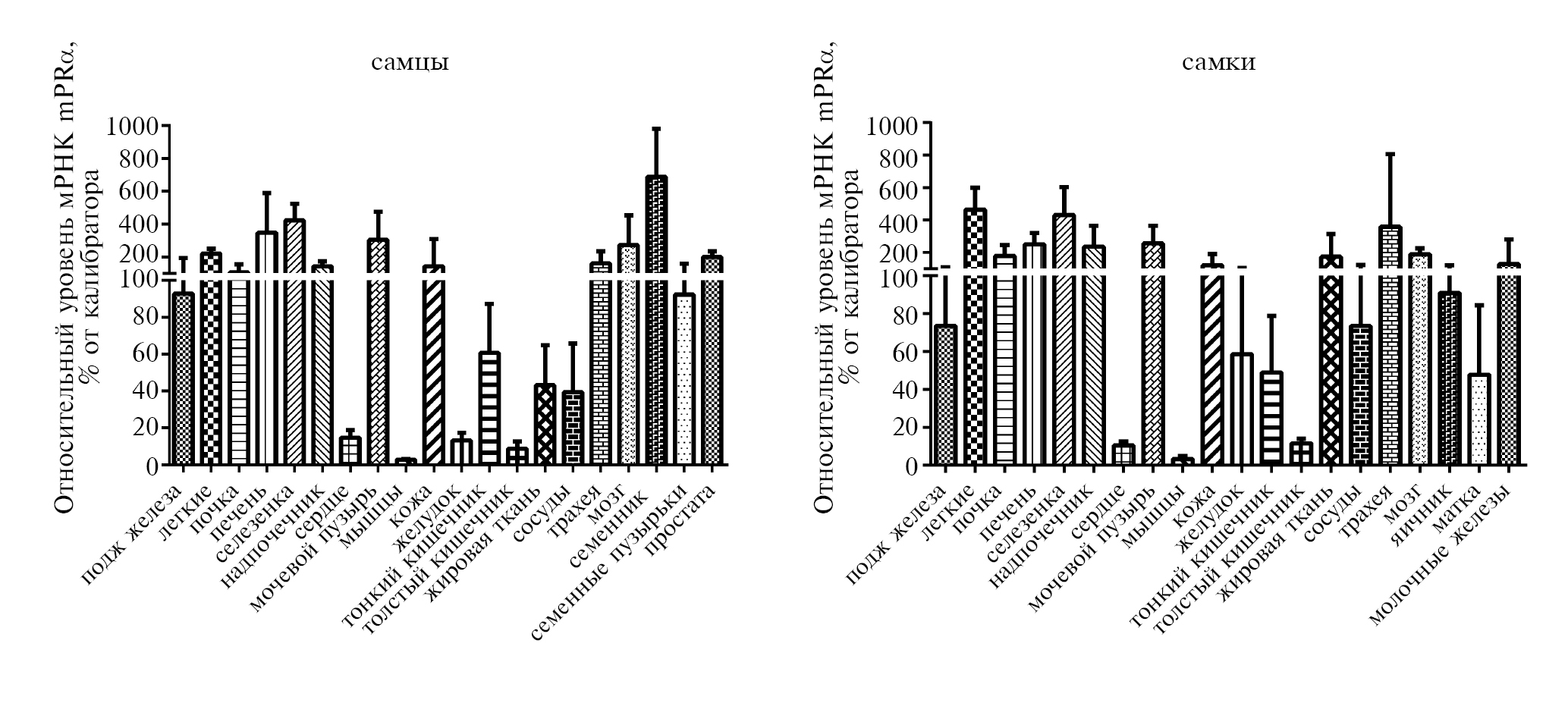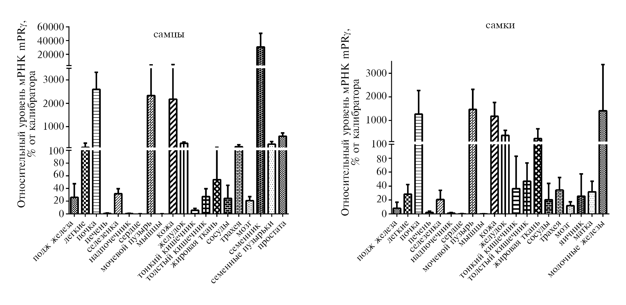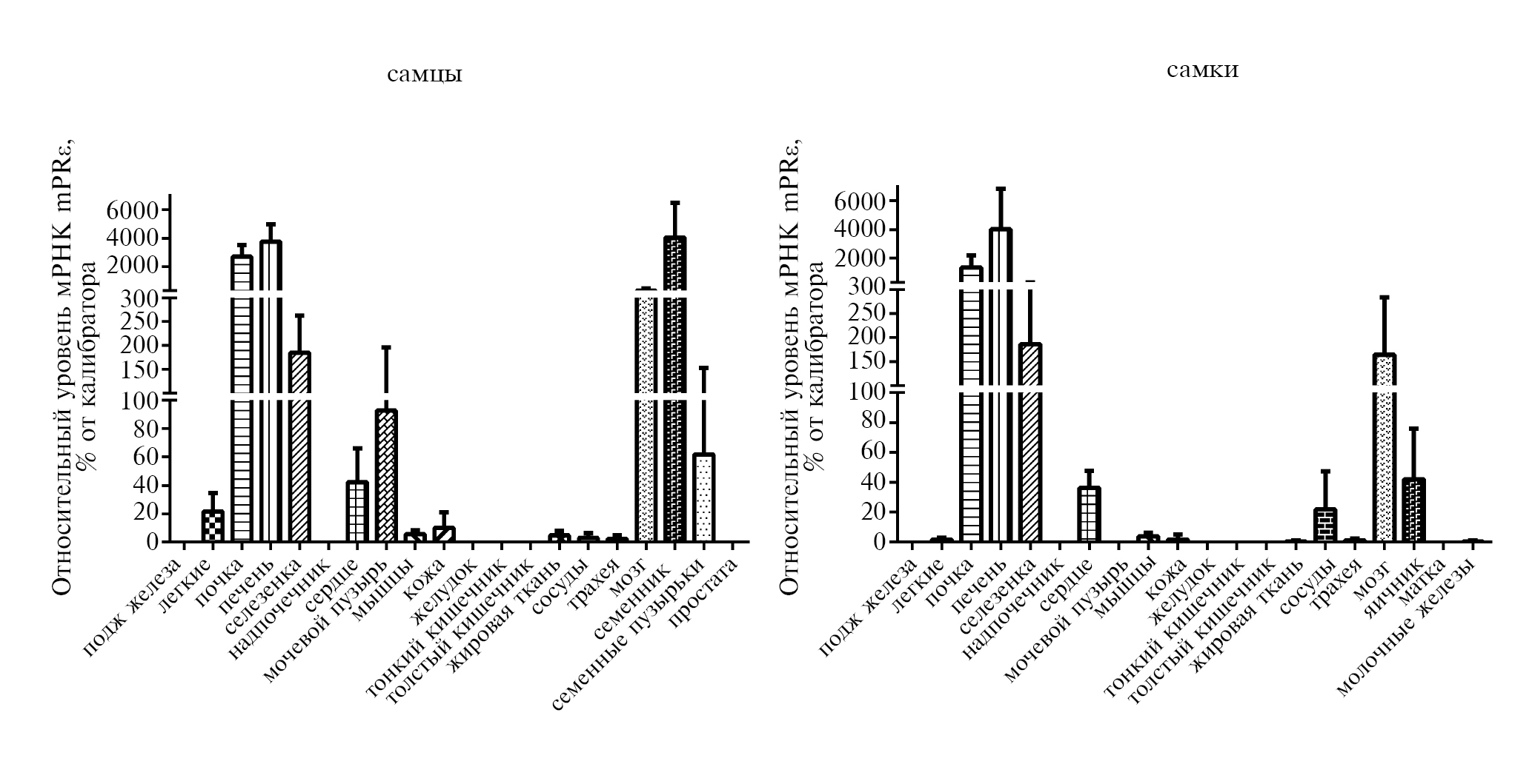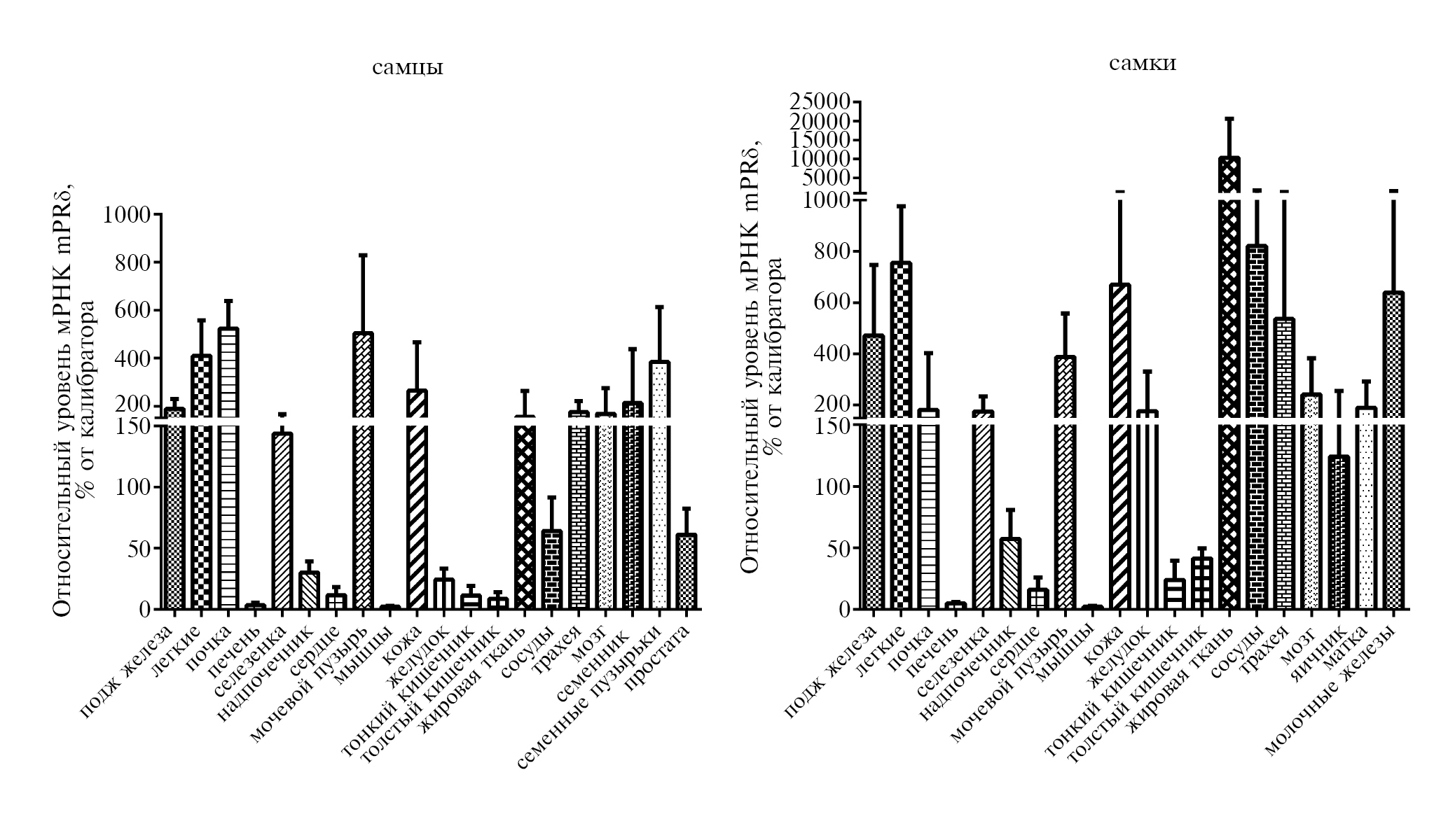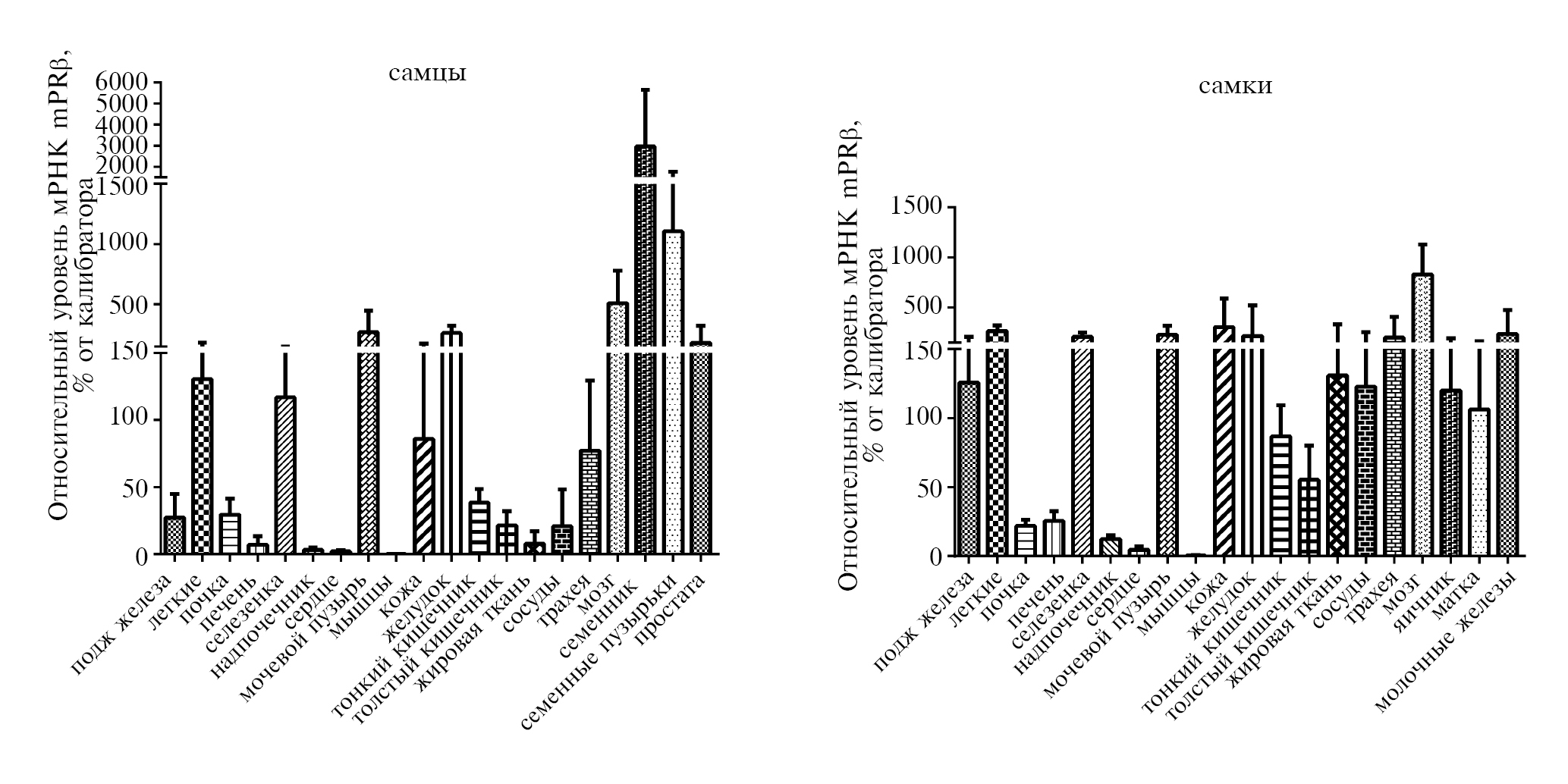 Уровень мРНК mPRβ во многих нерепродуктивных тканях преобладал у самок (рис. 3, табл. 4). В репродуктивных тканях самцов наблюдались очень высокие уровни мРНК этого рецептора в семенниках и в семенных пузырьках. Самые низкие уровни экспрессии гена рецептора mPRβ обнаружены у обоих полов в сердце, надпочечниках, а у самцов также в печени и жировой ткани. В мышцах и у самцов, и у самок экспрессия гена этого рецептора не выявлялась.