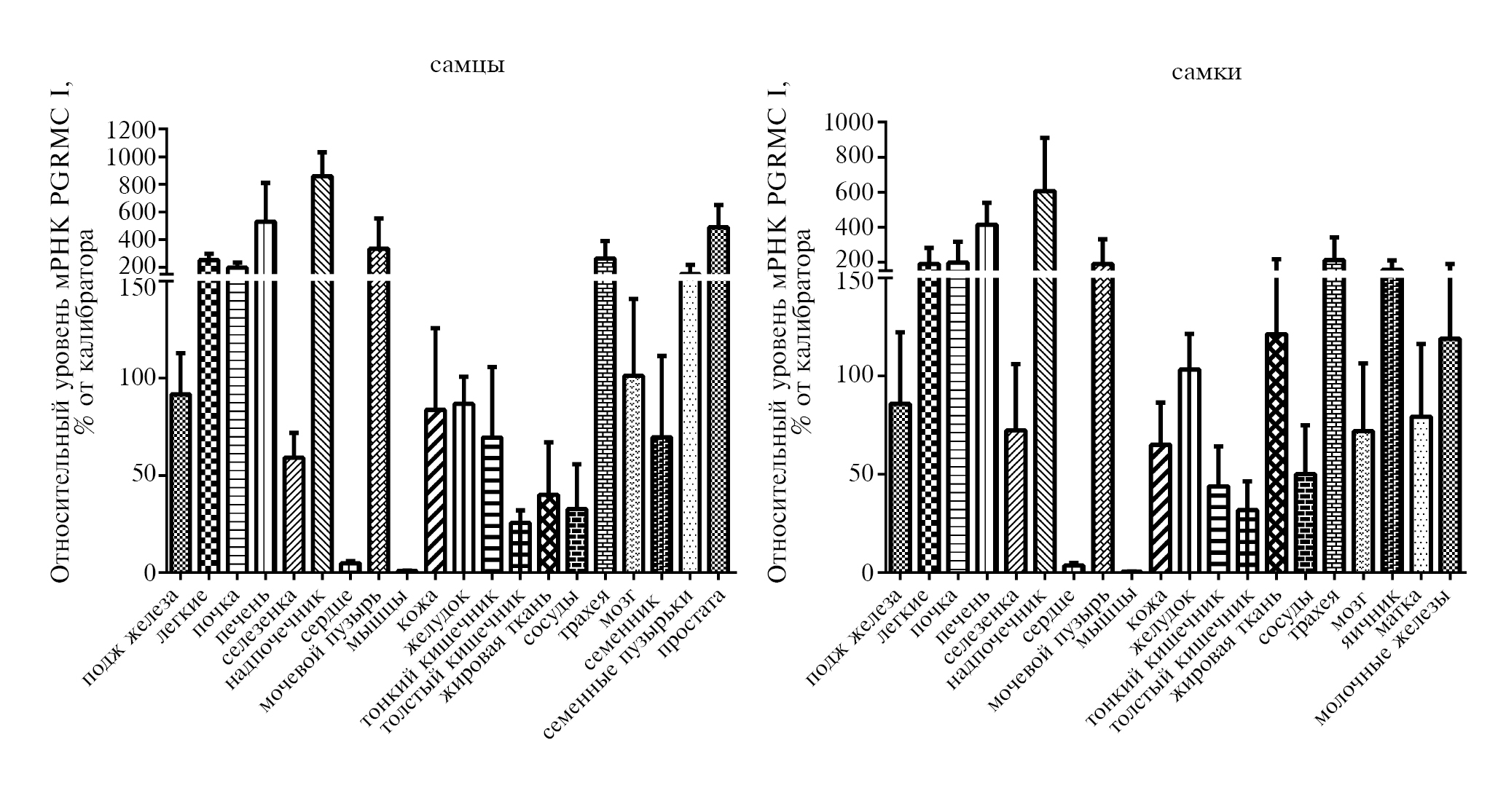Экспрессия гена PGRMC I наблюдалась практически во всех тканях у самцов и самок крыс на среднем уровне со сходным профилем распределения транскриптов (рис. 7). Фоновые уровни мРНК PGRMC I были в мышцах и сердце обоих полов. Половая дифференцировка выявлена в жировой ткани, где уровень мРНК у самок выше, и для мышц, где уровень мРНК PGRMC I преобладает у самцов.