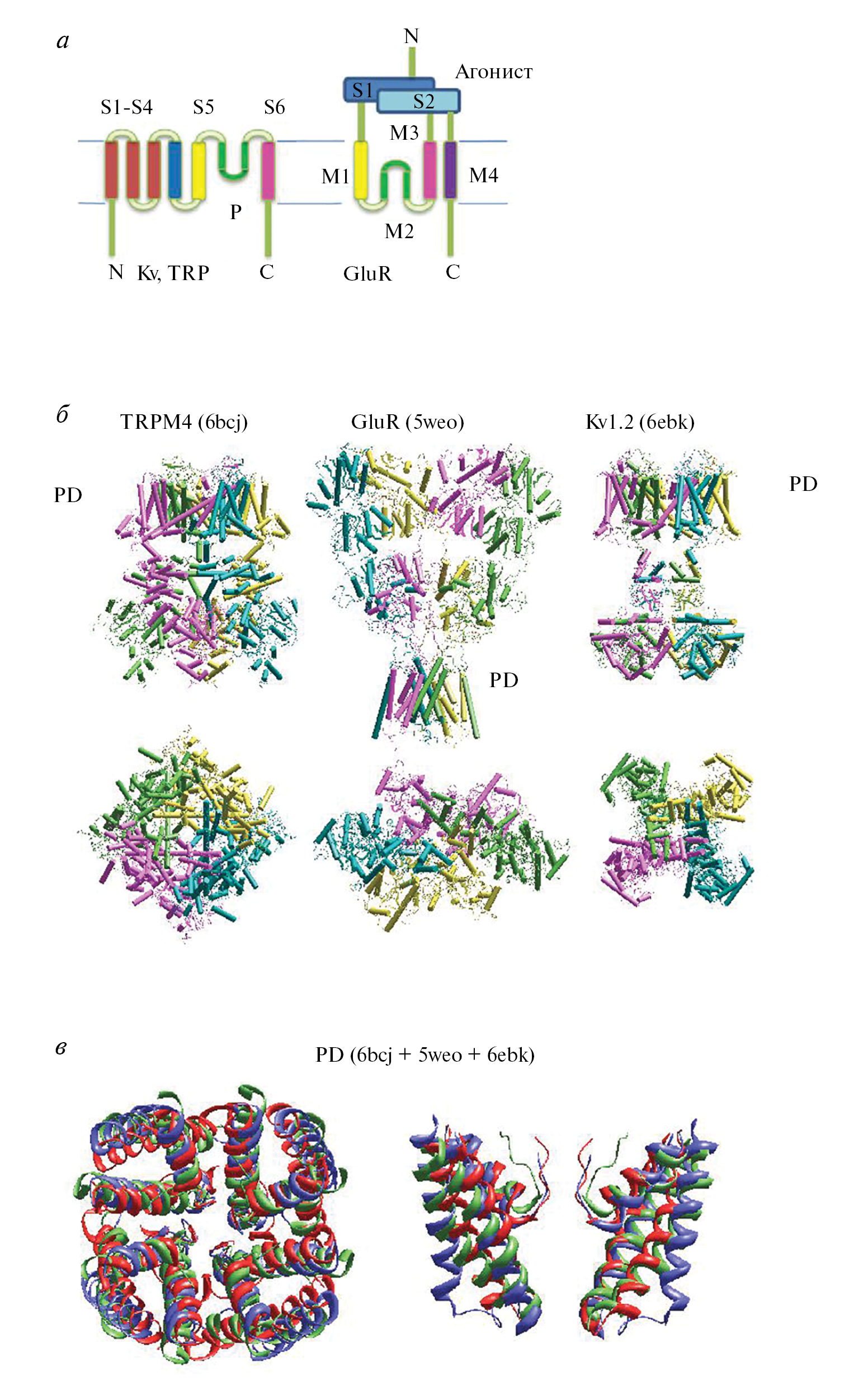 Рис. 1. Разнообразие структурной организации P-loop-каналов и консервативность их порообразующих доменов. а – Трансмембранная топология субъединицы TRP и 6-TM калиевого канала (KV) отличается от топологии субъединицы глутаматного рецептора (GluR), включая противоположную ориентацию Р-петли. б – Общая архитектура и доменная организация TRP, глутаматных рецепторов и 6-TM калиевых каналов совершенно различны. PD – порообразующий домен. в –Наложение порообразующих доменов показывает их высокое сходство. Структуры 6dm0, 6ebk и 6bcj показаны синим, красным и зеленым.