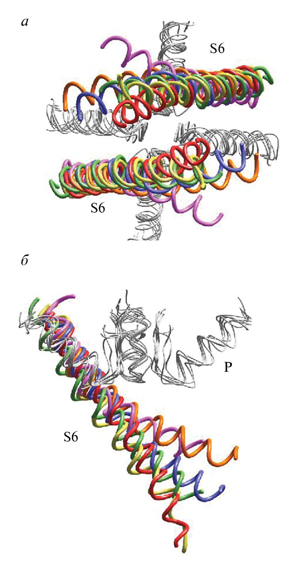 Рис. 2. Разнообразие активационных перестроек во внутренних спиралях. а – вид в плоскости мембраны, б – боковая проекция. Закрытое состояние KcsA (1bl8) показано красным. В открытых состояниях MthK (1lnq), KvAP (1orq), AMPA-типа рецептора глутамата (5weo), Kv1.2 (2r9r) и TRPV6 (6bo8), внутренние спирали показаны фиолетовым, оранжевым, желтым, синим и зеленым соответственно.