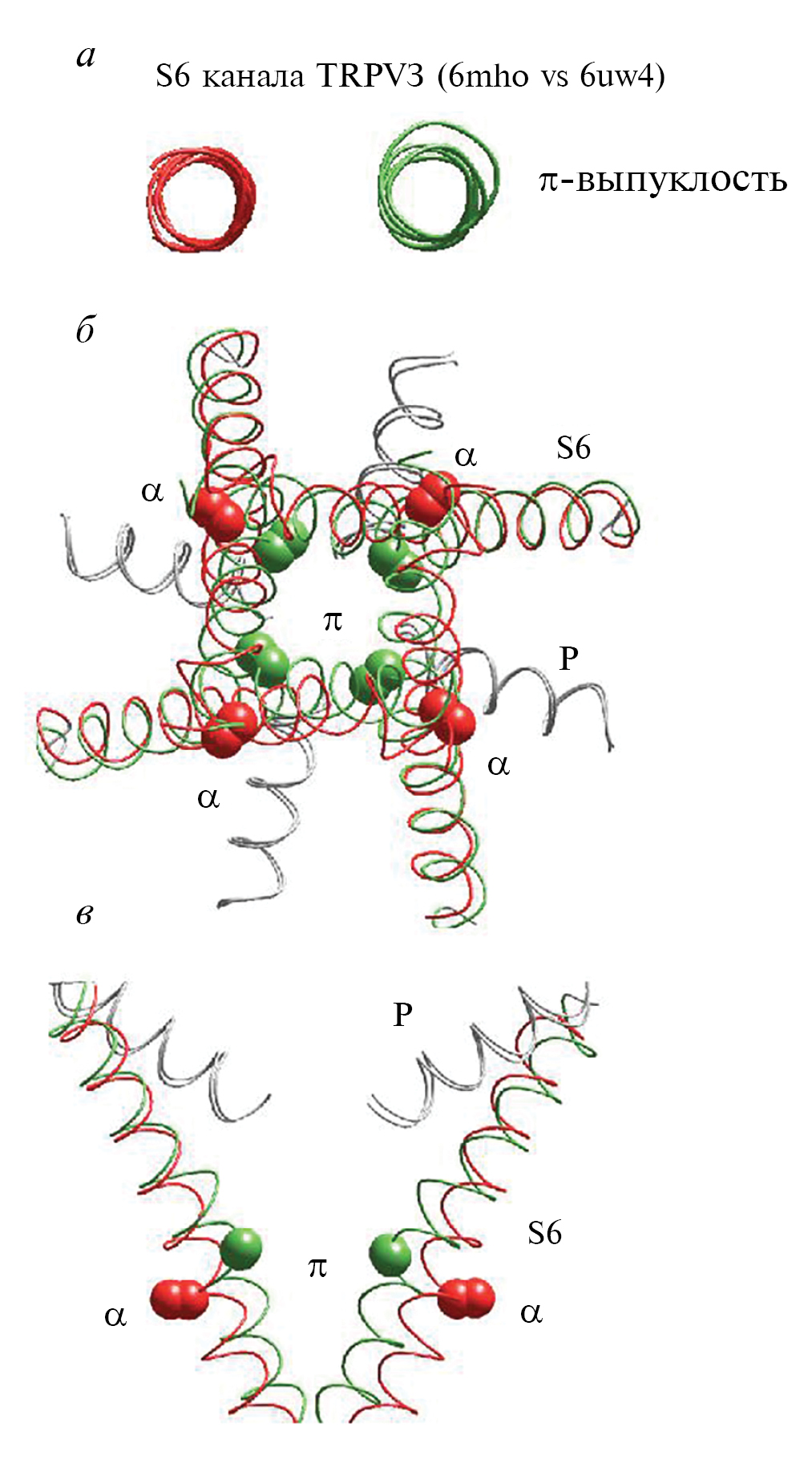 Спирали S6 TRP-каналов демонстрируют большое разнообразие π-выпуклостей [106, 107]. Интересно, что спирали в разных структурах одного и того же канала могут либо не иметь π-выпуклостей, либо обладать ими. Эта изменчивость предполагает, что динамические π-выпуклости могут регулировать конформационные перестройки в канале. Действительно, анализ структур каналов TRPM6 показывает, что сегменты S6 претерпевают конформационный переход от α-спирали к π-выпуклой спирали при открытии канала [108]. В каналах TRPV1 и TRPV2 наличие α-спиральных сегментов S6 по сравнению со спиралями S6 с энергетически менее выгодными π-выпуклостями может отражать различные функциональные состояния каналов [109]. Сравнение структур класса II и класса III канала Cav1.1 кролика позволяет предположить, что переход спирали S6III из конформации с π-спиральным элементом в α-спиральную связан с движением спирали наружу и осевым вращением [110]. Исчезновение π-выпуклостей связано с расширением ворот активации в Cav1.1, но с сужением в TRPV6. Таким образом, четкая взаимосвязь между размерами поры в области активационных ворот и наличием π-выпуклостей не очевидна. Вероятно, π-выпуклости увеличивают гибкость спиралей S6 в каналах, в которых отсутствуют глициновые шарниры, присутствующие в калиевых каналах.