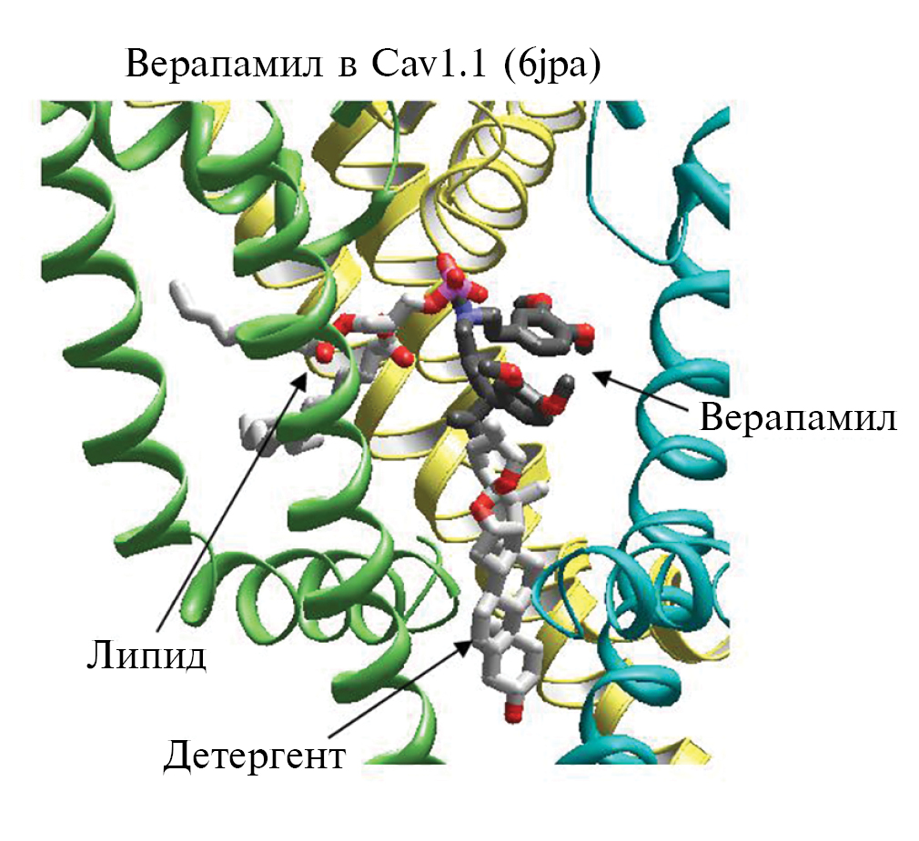 Рис. 5. Молекулы липида и детергента взаимодействуют с молекулой верапамила в поре кальциевого канала.