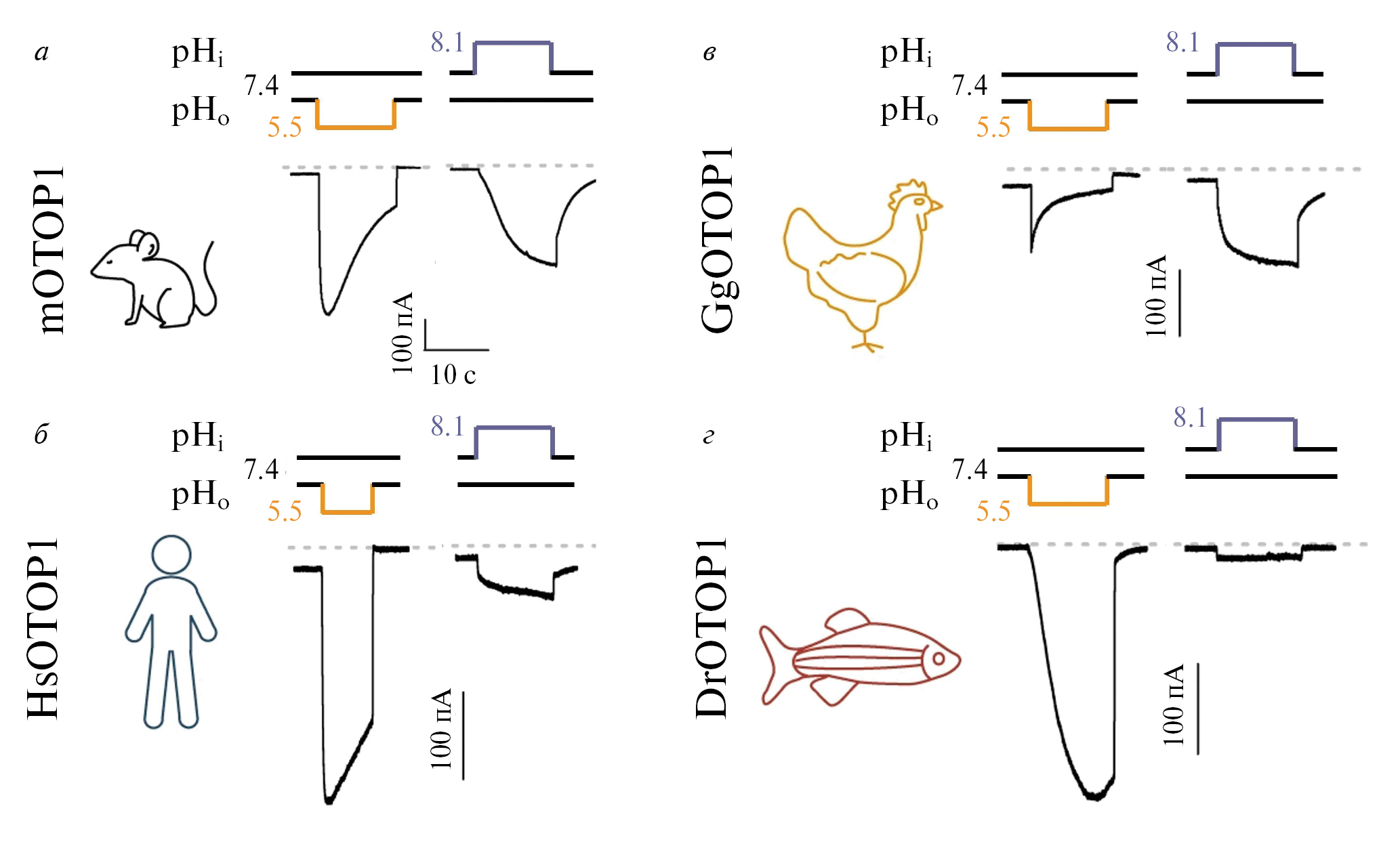 Рис.1 Ответы клеток HEK-293, экспрессирующих OTOP1 мыши (а), человека (б), цыпленка (в) или зебры-фиш (г) на аппликацию стимула с pHo 5.5 или pHi 8.1, как показано в (а) (модифицировано из [20] по лицензии Creative Commons Attribution 4.0 International License).