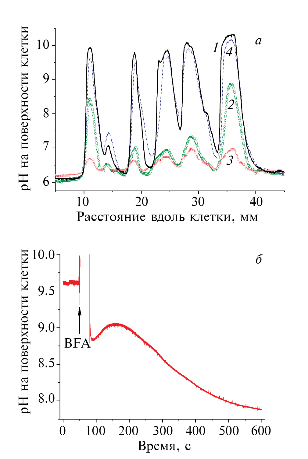 Профили рН, измеряемые сканирующим рН-микроэлектродом на освещенном междоузлии длиной 50 мм (рис. 1а, кривые 1, 4), содержат до шести щелочных полос со значениями рНо около 10.0, которые чередуются с кислыми зонами (рНо 6.2–6.5). В молодых междоузлиях зоны с низкими и высокими рНо не имеют видимых отличий. Однако зрелые и стареющие клетки часто выглядят полосатыми. В этих клетках зеленые некальцинированные области чередуются с зонами осаждения кристаллов, главным образом СаСО3, которые придают щелочным зонам белесую окраску. Неоднородный профиль рНо формируется только на свету, исчезает за время ~20 мин после переноса клеток в темноту, а также спрямляется на свету при подавлении фотосинтеза диуроном. Брефелдин А (БФА) – ингибитор внутриклеточного везикулярного транспорта – оказывает сильное подавляющее действие на щелочные зоны освещенных клеток [17]: величина рНо снижается от 9.5–10.0 на 2–2.5 ед. в течение 10 мин после добавления этого агента (рис. 1б). На нынешний день БФА является наиболее сильным известным ингибитором, действие которого не связано с подавлением фотосинтетического потока электронов. По-видимому, процессы эндо- и экзоцитоза, подавляемые брефелдином А, необходимы для поддержания транспортных систем, участвующих в трансмембранном переносе протонов. Кроме того, неоднородный профиль рН временно исчезает после генерации одиночного электрического импульса на плазмалемме [18] (рис. 1а, кривые 1–3).