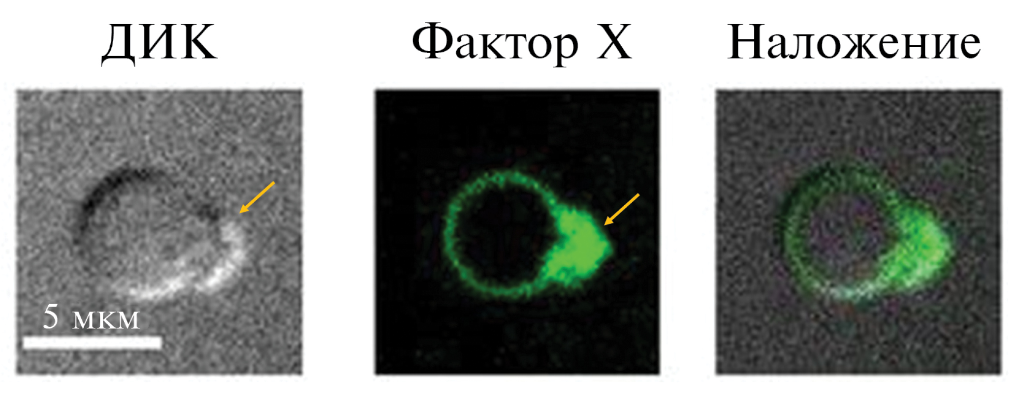 Рис. 3. Концентрирование факторов свертывания в «шапке» тромбоцита. ДИК – изображение, полученное методом дифференциально-интерференционного контраста; в центре (Фактор Х) – эпифлуоресцентное изображение в канале фактора Х, справа (Наложение) – наложение первых двух изображений. Желтая стрелка отмечает «шапку» [115].