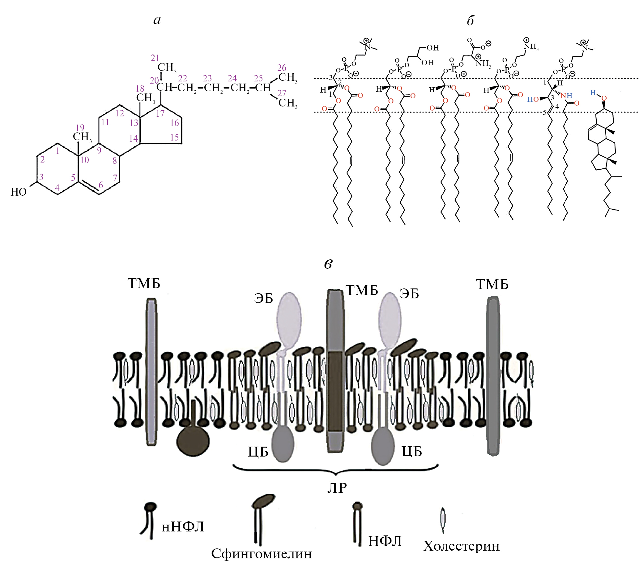 Рис. 1. Молекула холестерина (а) (PubChem CID5997) и его предполагаемое расположение в монослое мембранных фосфолипидов (б) и в бислойной липидной мембране, представляющей основу клеточной мембраны (в). На упрощенной схеме мембраны (в) липидный бислой содержит глицерофосфолипиды с ненасыщенными и насыщенными жирнокислотными остатками (нНФЛ и НФЛ соответственно), сфинголипиды и холестерин. В бислой встроены ассоциированные с мембраной цитоплазматические (ЦБ) и экстраклеточные (ЭБ) белки, а также трансмембранные белки (ТМБ). Бислой содержит липидные рафты (ЛР) – микродомены, обогащенные сфингомиелином и холестерином.